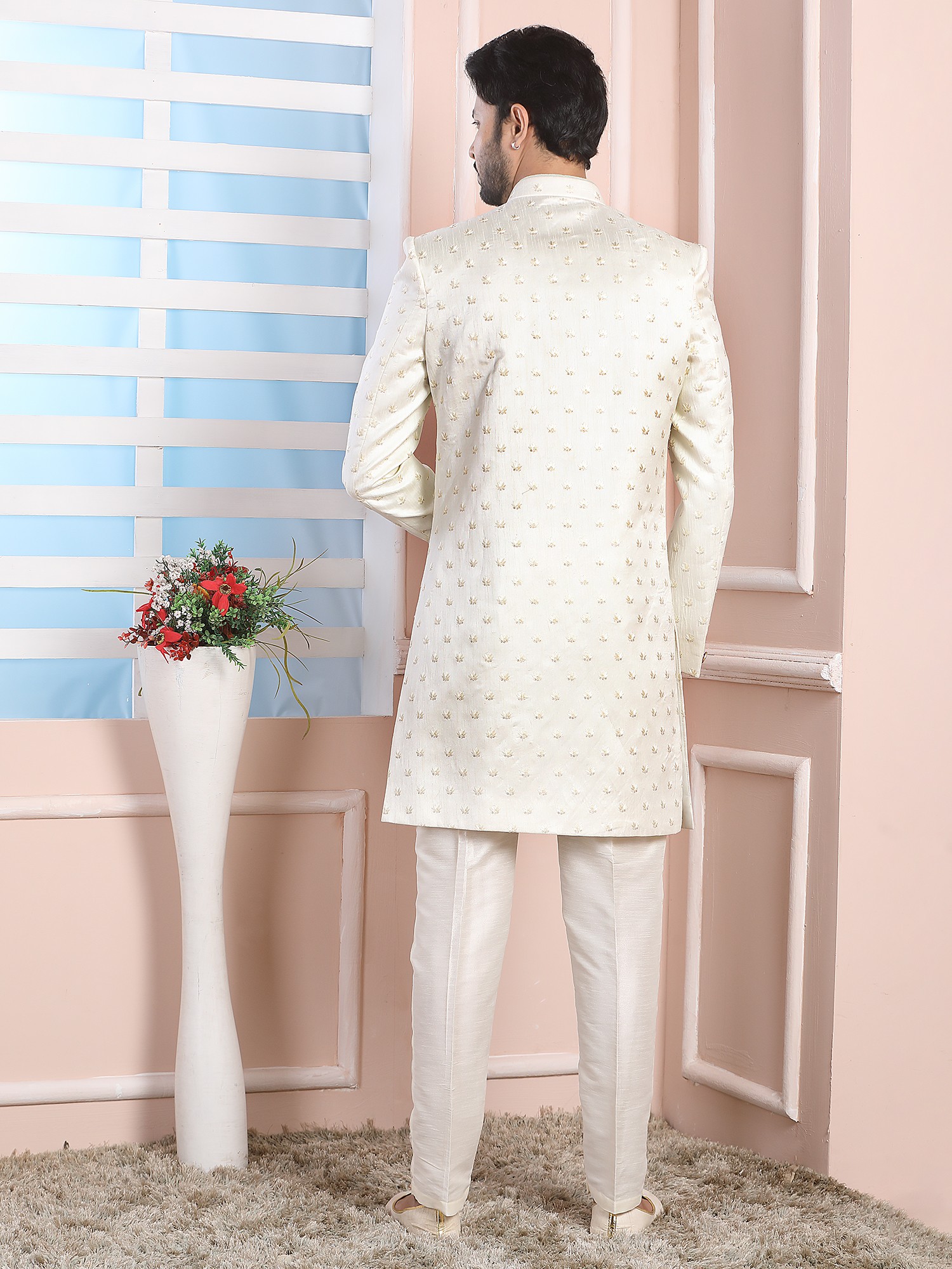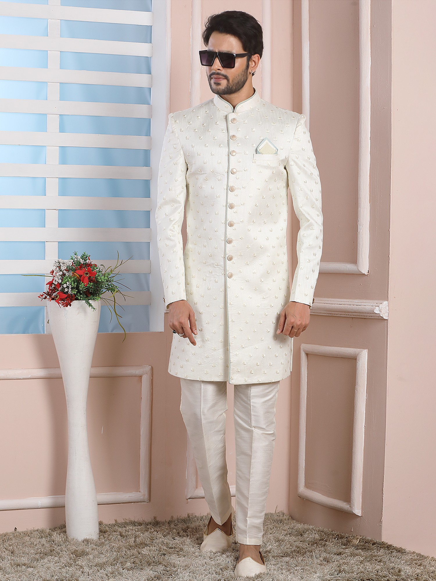 Elegant Jacquard Silk Indo Western Sherwani With Luxe Dupion Art Silk Aligarhi Pant For Wedding Sangeet Glam