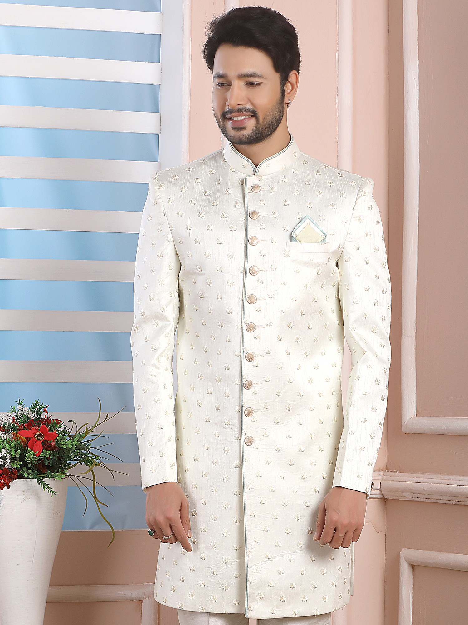 Imported Jacquard Silk Indo Western Sherwani With Dupion Art Silk Aligarhi Pant For Wedding Groom Men