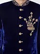Admire the regal gold embroidery adorning the neckline and a striking, emblematic motif on the chest, each stitch a testament to painstaking detail. Contrasting gold buttons provide a polished finish, harmonizing beautifully with the vibrant royal blue. The tailored silhouette creates a distinguished profile, offering a flattering and commanding appearance.