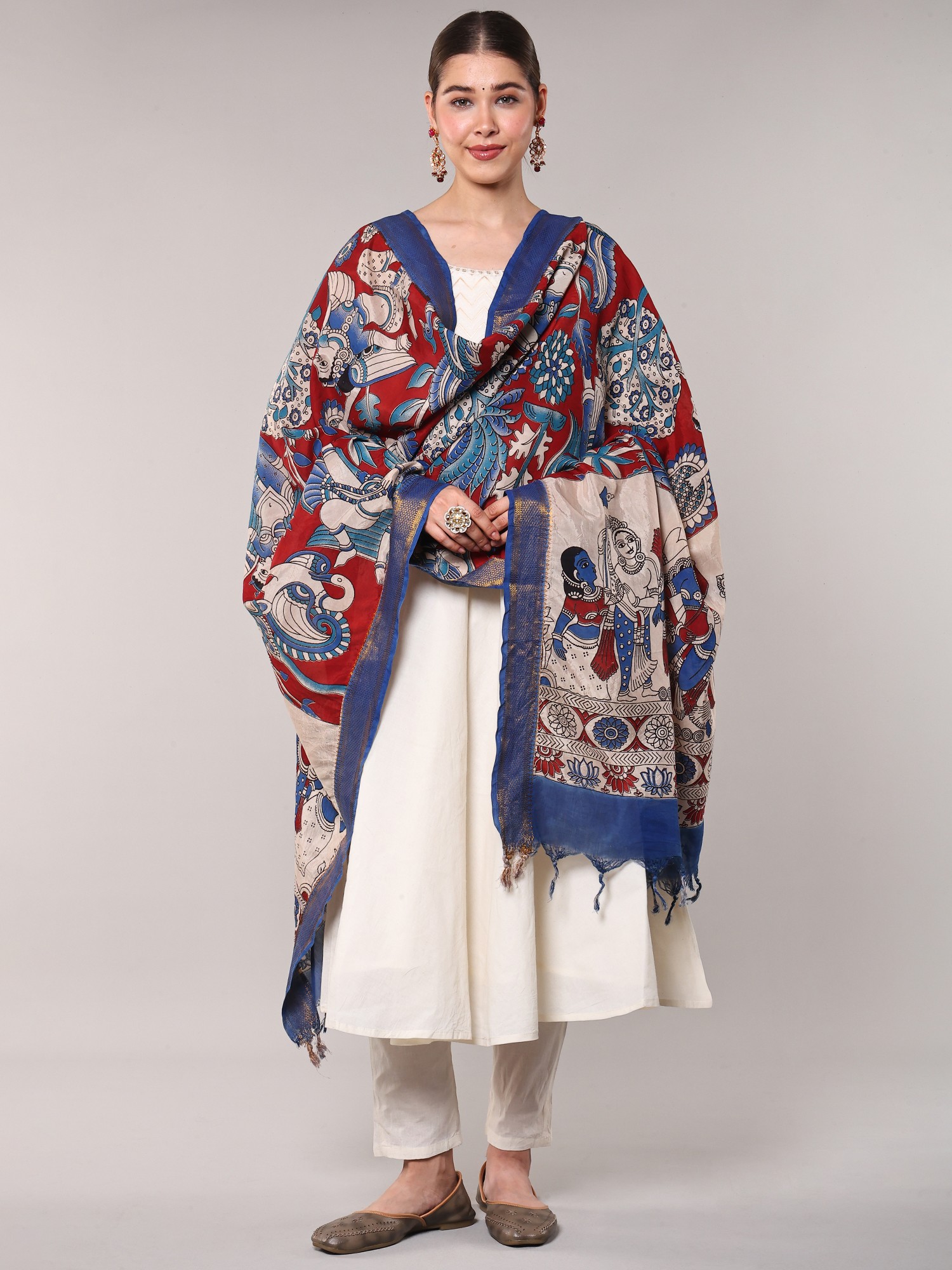 Kalamkari Dupatta from Telangana with Zari Border and Printed Paisleys