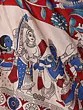 Be captivated by the vibrant narrative that unfolds across its generous expanse. Bold strokes of red and deep blue bring to life a celestial gathering, featuring graceful angels and a spirited musical ensemble. The rich Zari border adds a touch of opulence, catching the light with every movement and accentuating the captivating imagery.