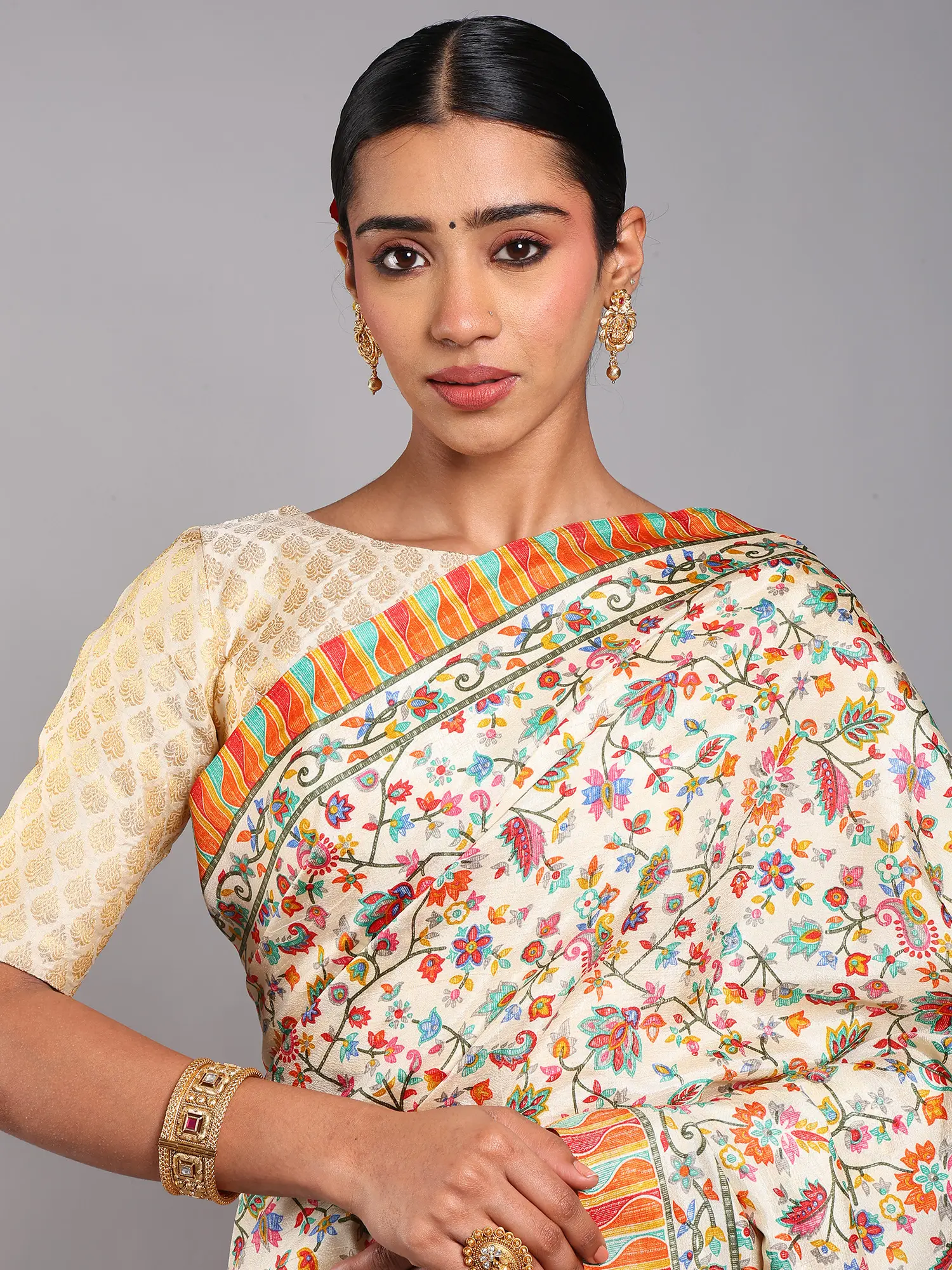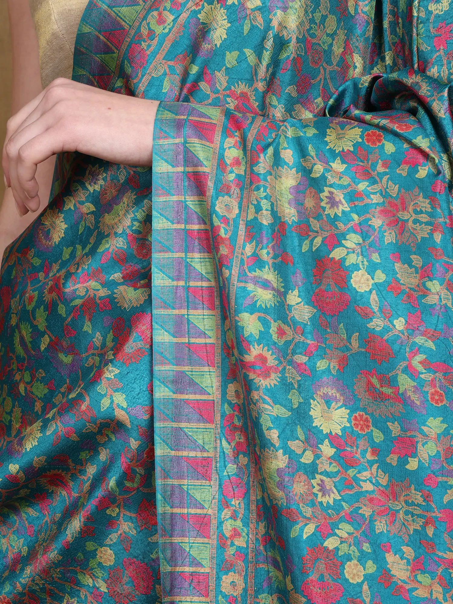 Vine Border and Floral Pallu Digital Printed Kani Polyester Saree with Shawl and Blouse