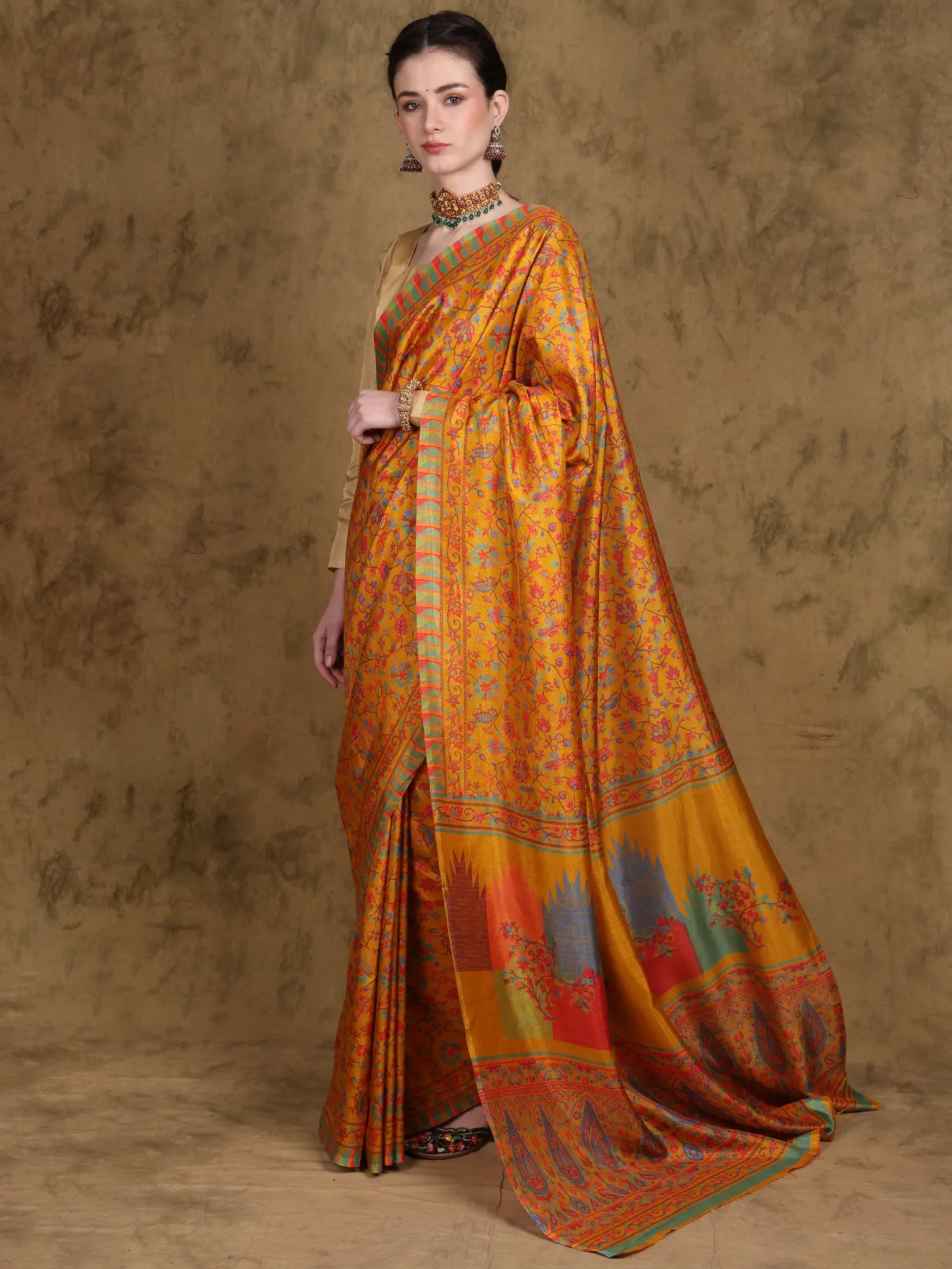 Pastel-Yellow Digital Printed Kani Polyester Saree with Floral Border and Shawl