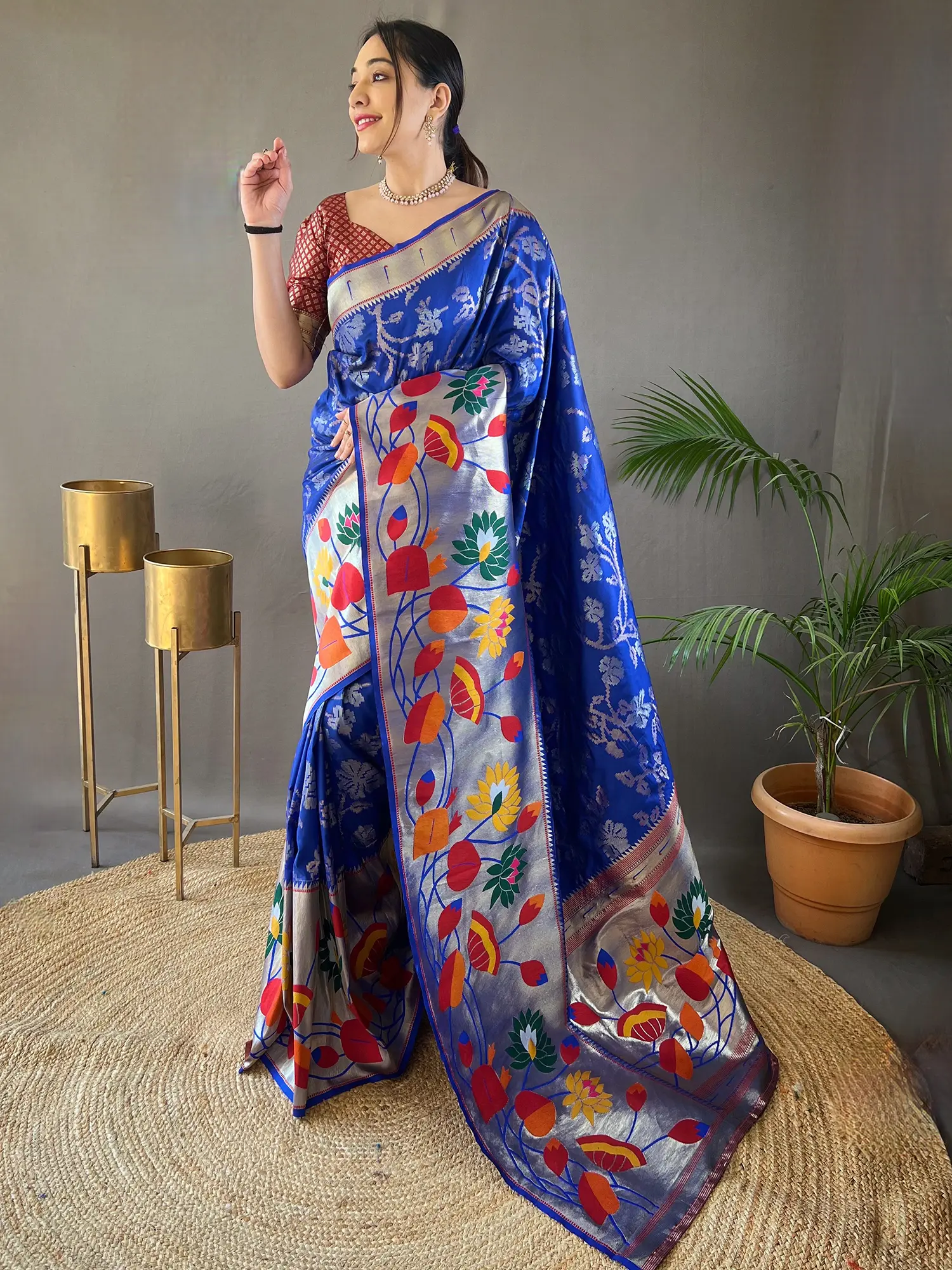 Intricate weaving showcases stylized lotus and floral motifs in gold, red, blue, and orange.