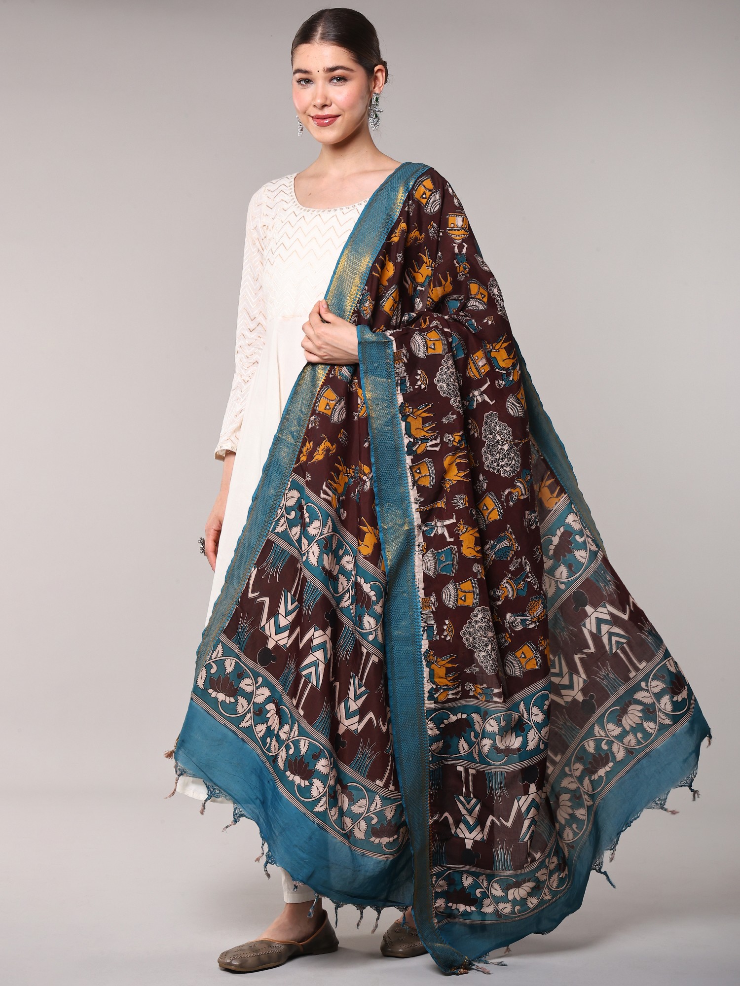 Tap-Shoe Printed Kalamkari Dupatta from Telangana with Zari Border