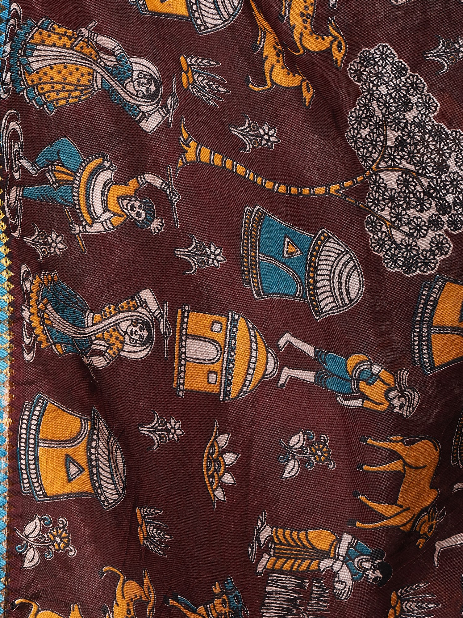 Features intricate Kalamkari art depicting lively village life scenes.