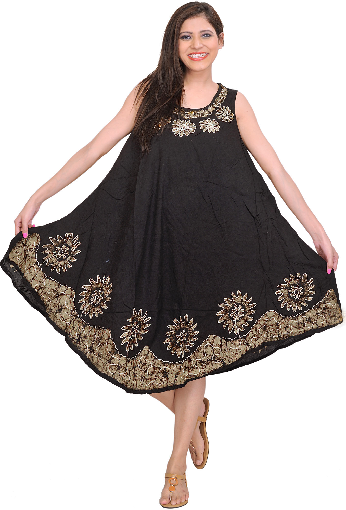 Chic and feminine in its appeal, this printed cotton dress comes with the classic Batik print and ethnic threadwork details that make this casual wear anything but casual. The comfort of viscose and the classic charm of black is the perfect blend with the gorgeous fit of the dress. With Batik floral motifs on the neckline and hem, it becomes a statement of ease and elegance.