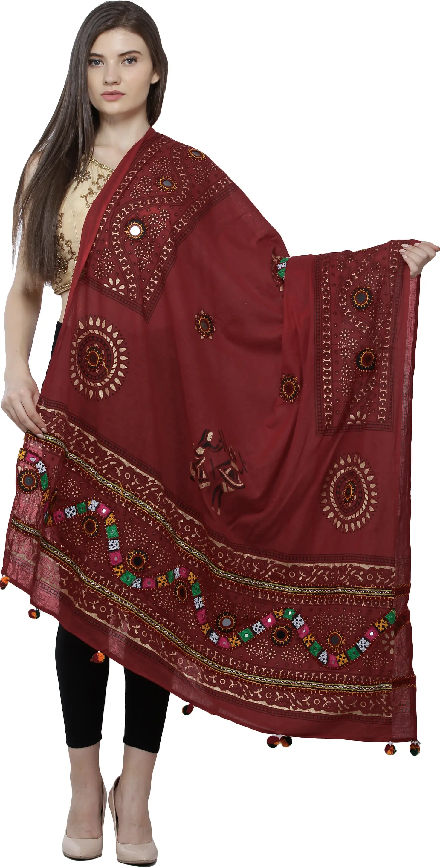 This stunning dupatta is designed to elevate any outfit. It pairs beautifully with traditional Indian wear like kurtis, salwar kameez, and lehengas, instantly transforming a simple look into a statement piece. For a more contemporary twist, consider draping it over a solid-colored top or a Western dress to add a bohemian flair. Whether you're attending a wedding, a festive celebration, a cultural event, or simply want to add a touch of handcrafted beauty to your everyday style, this dupatta is the perfect choice. It's a conversation starter, a piece that embodies cultural pride and timeless craftsmanship.
