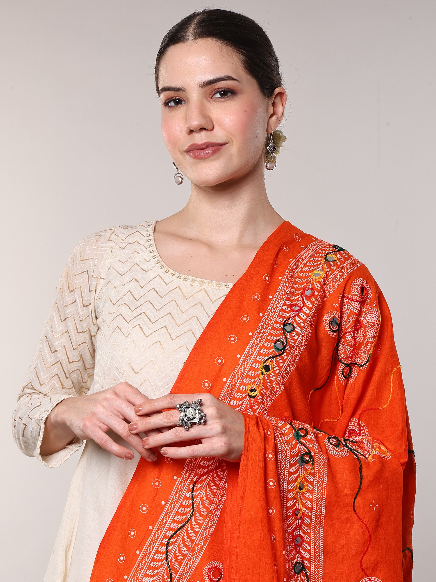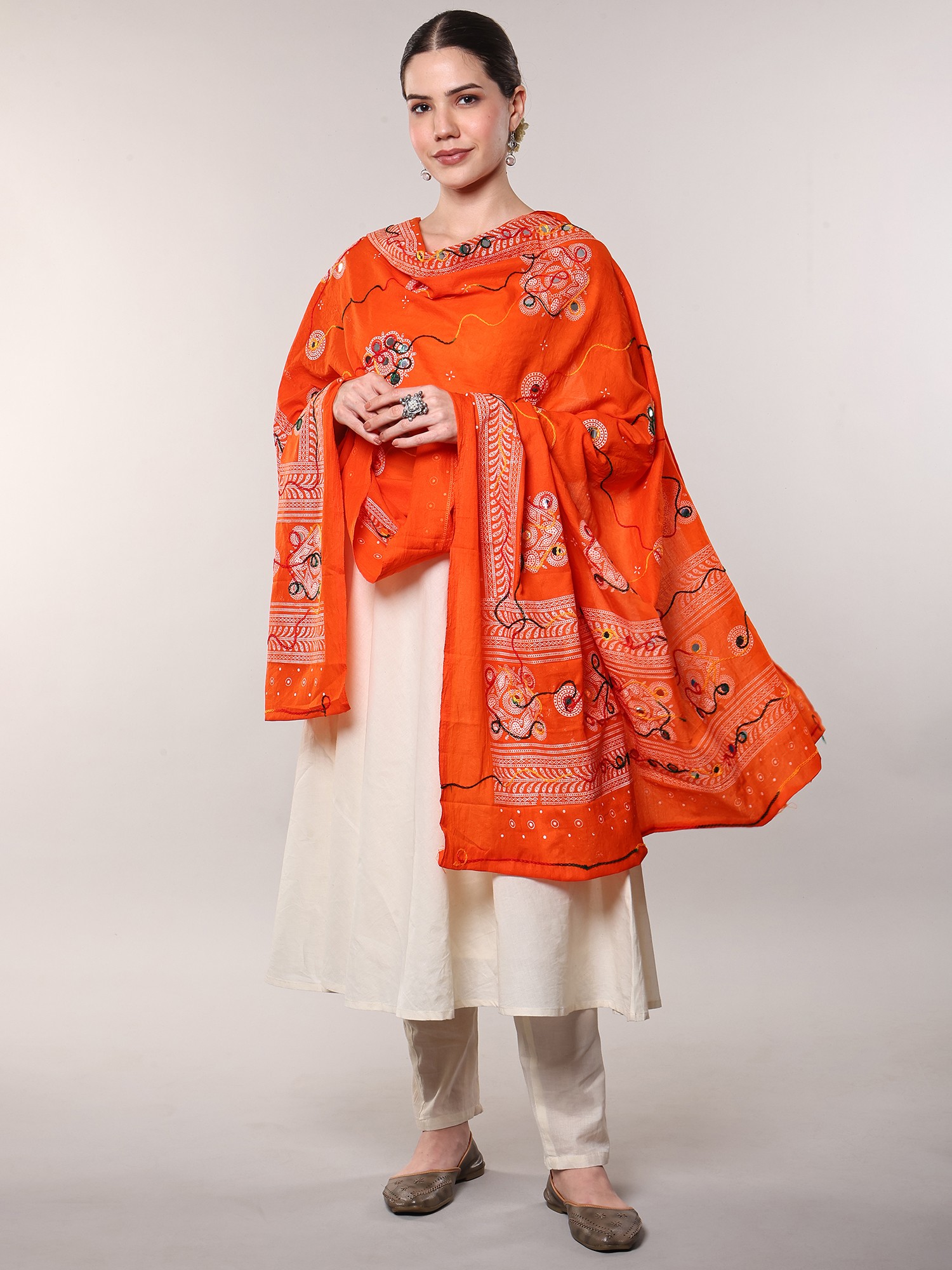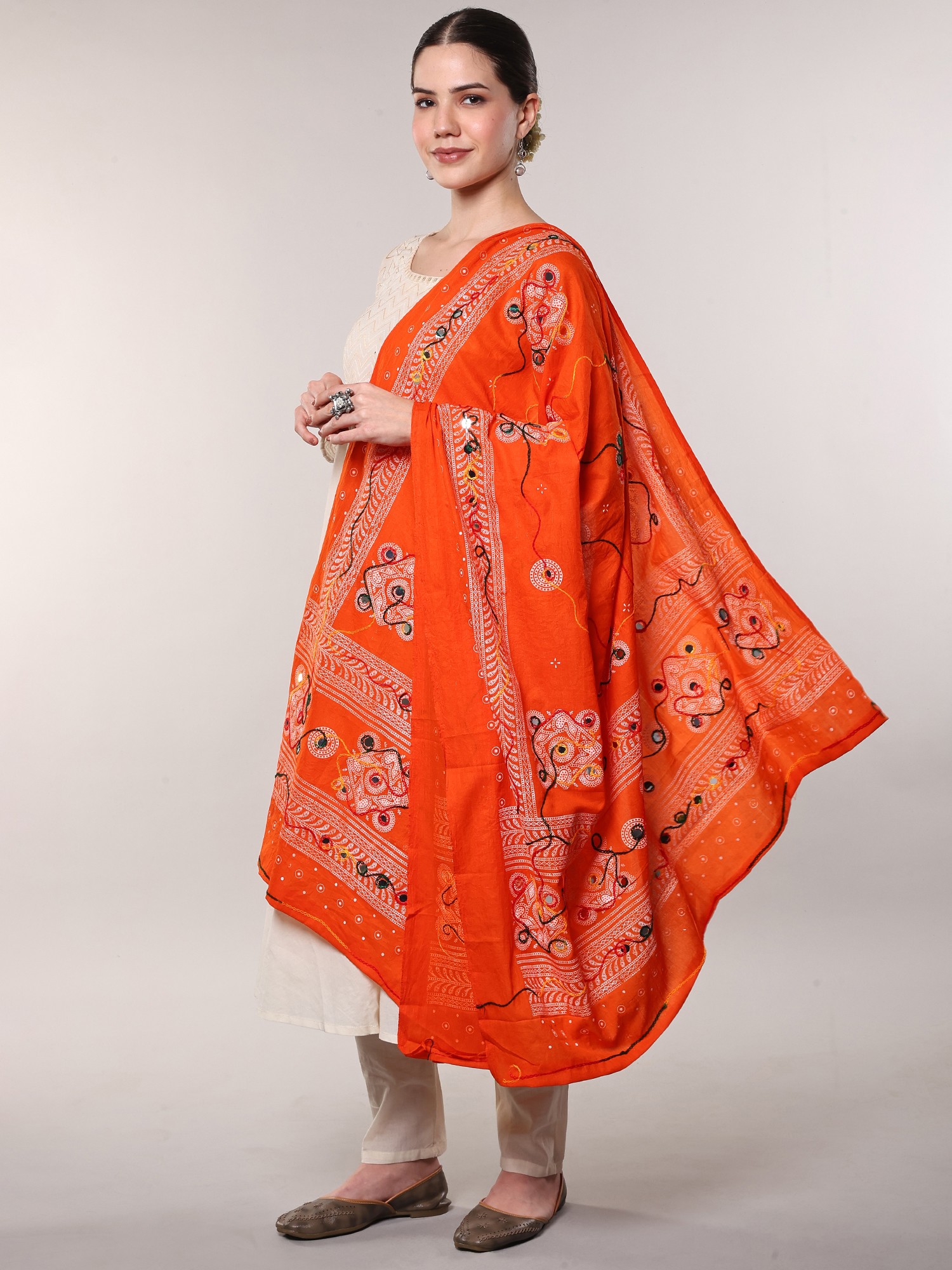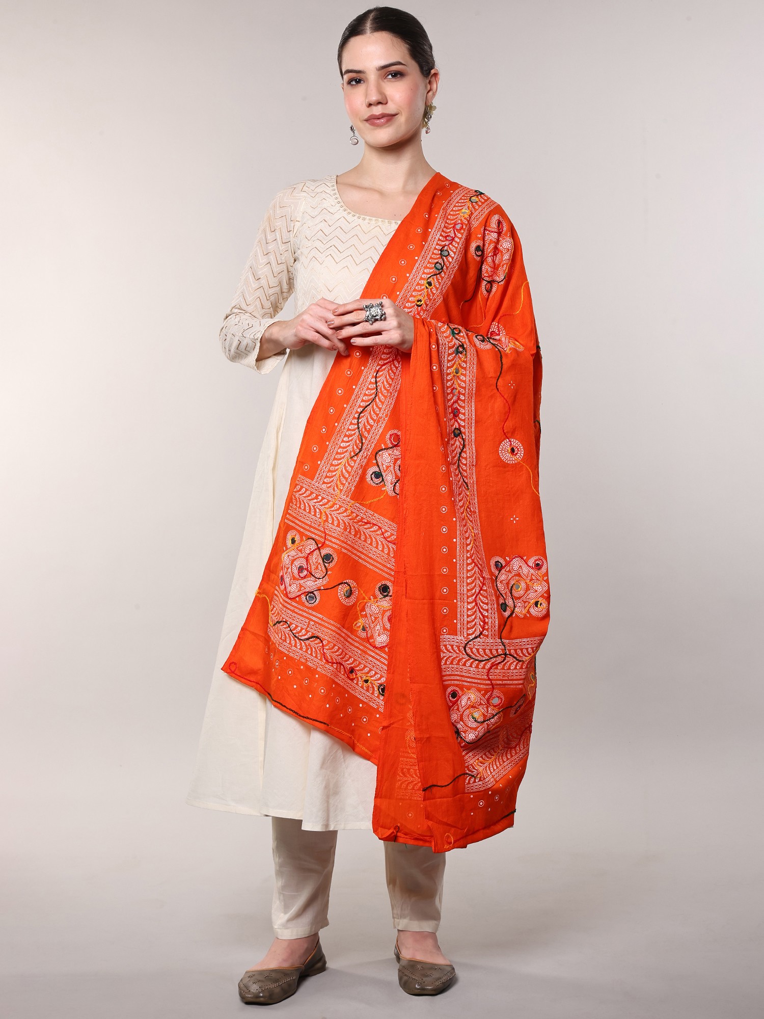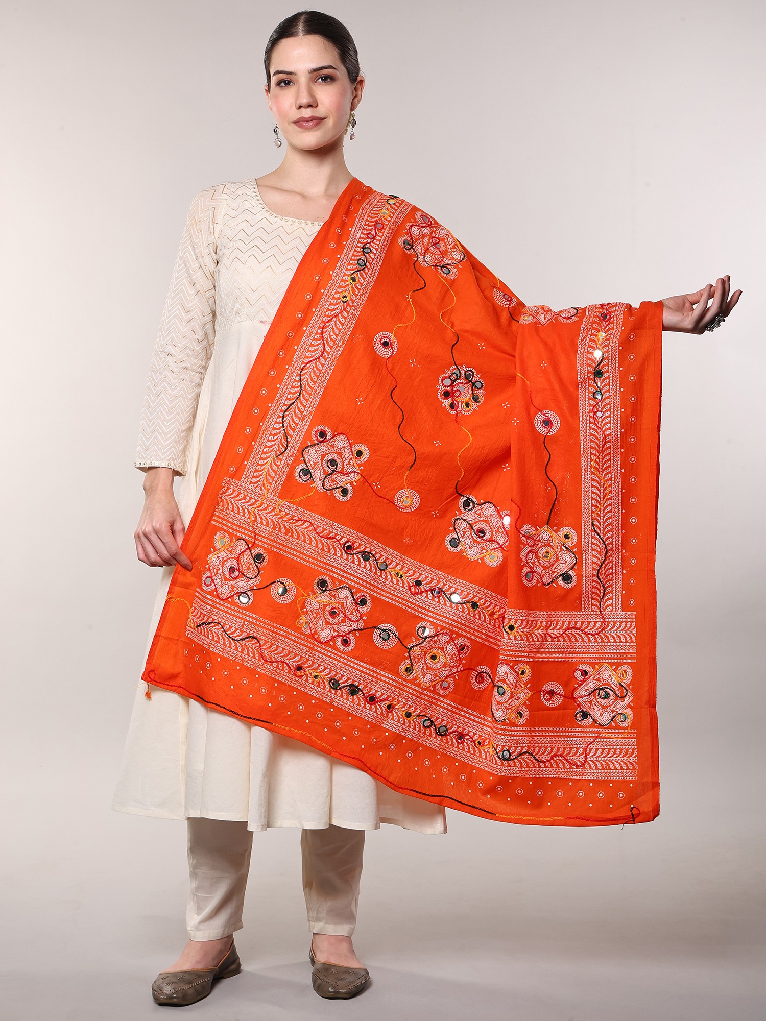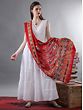 Handcrafted printed dupatta with interesting hand-embroidered floral and mirrors, is dipped in the gorgeous white color and intertwined with colorful threads to form an intriguing pattern. This dupatta drapes effortlessly and warmly is easy to maintain and is assured to shine and glow for as you pair it with your favorite ethnic wear. A charming addition to your traditional wear wardrobe, this white dupatta is said to fit like a glove as you lay it over your shoulders. Available in 2 superb colors, this exquisite layering piece will be the best investment you can make to add sophistication and timeless charm to your traditional wear.