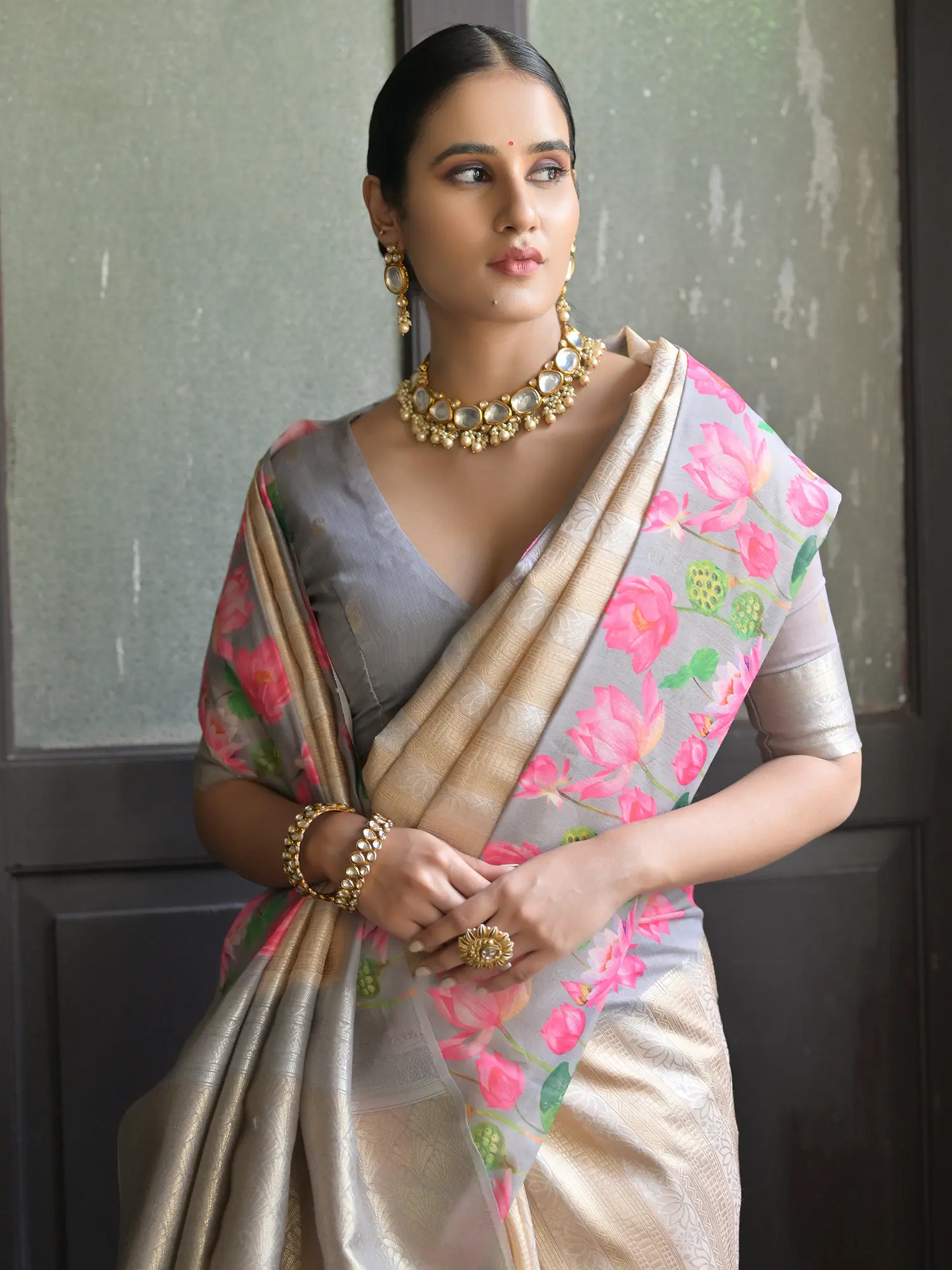 Burnt-Brick Pure Cotton Buddha with Fauna-Flora Printed Kalamkari Saree and Zari Border