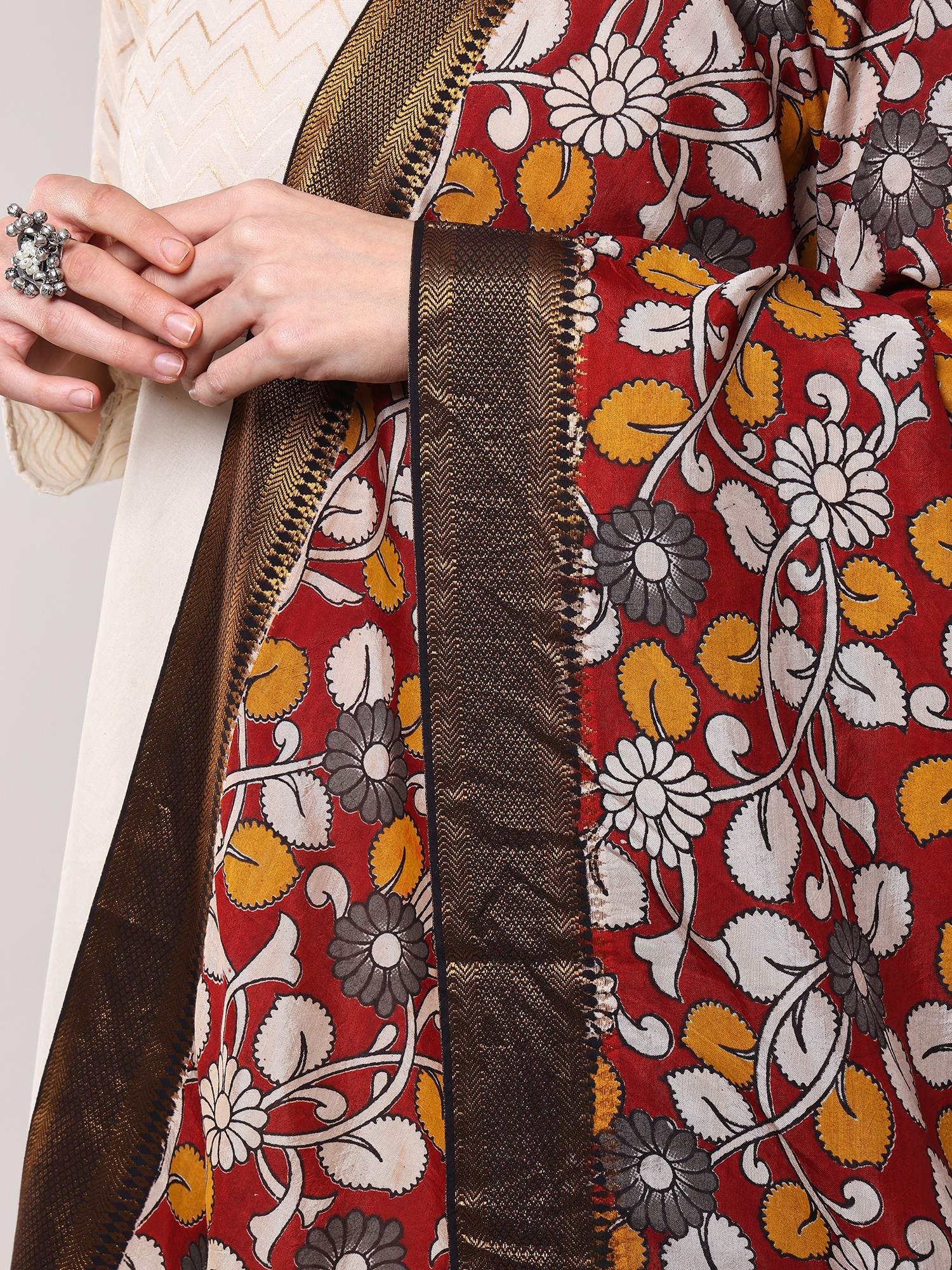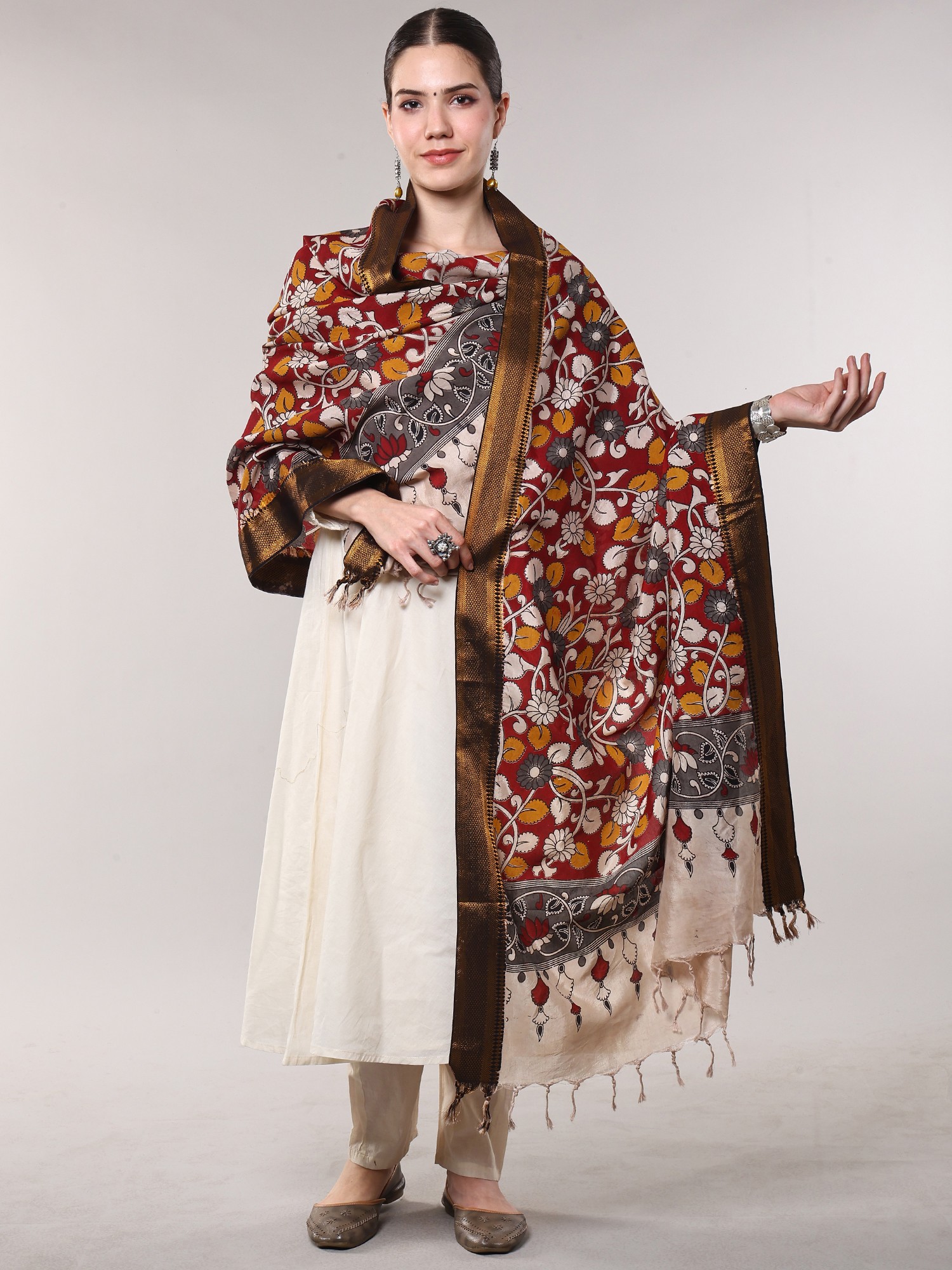 Kalamkari Dupatta from Telangana with Floral Vine Print and Zari work Border