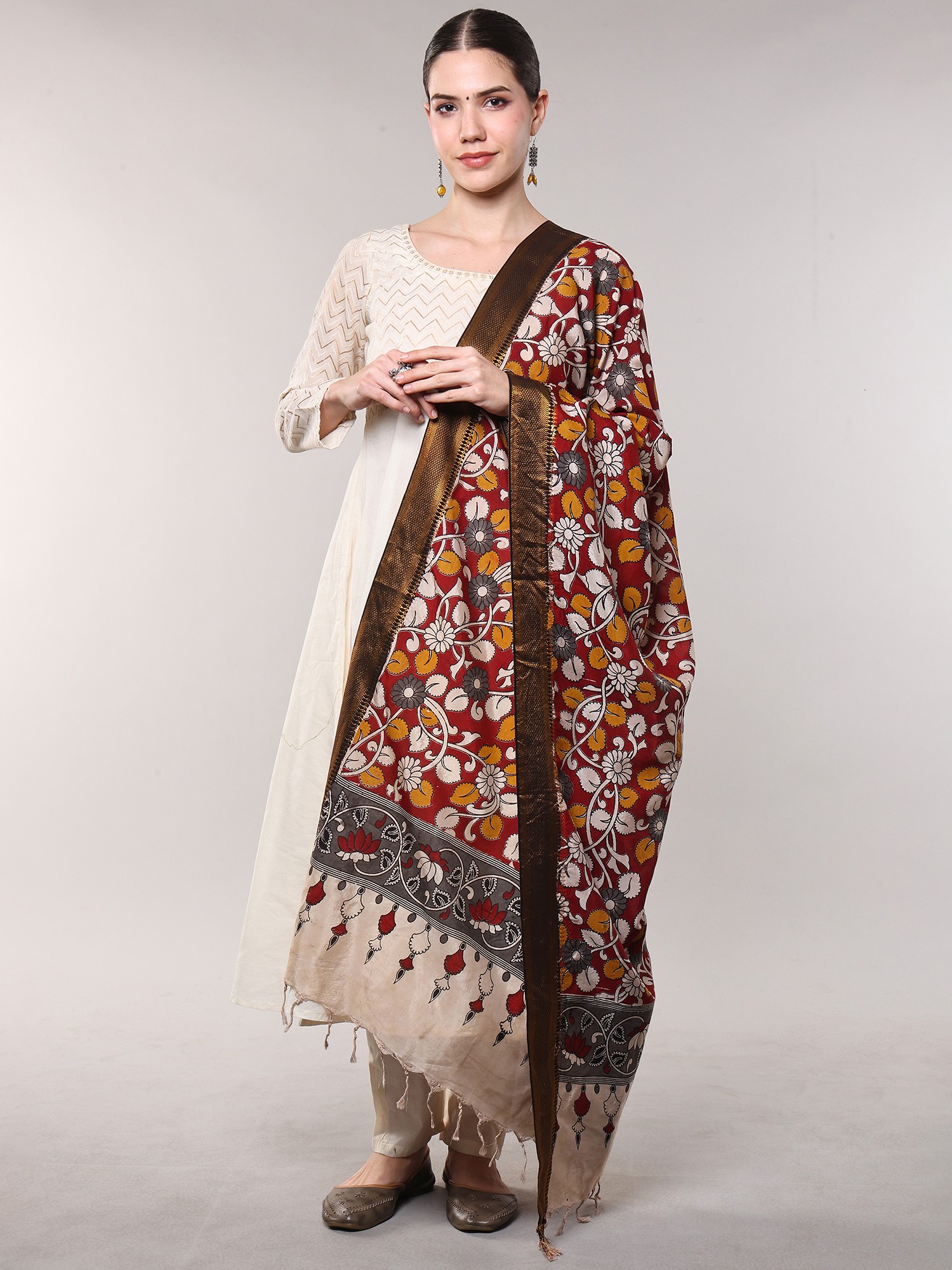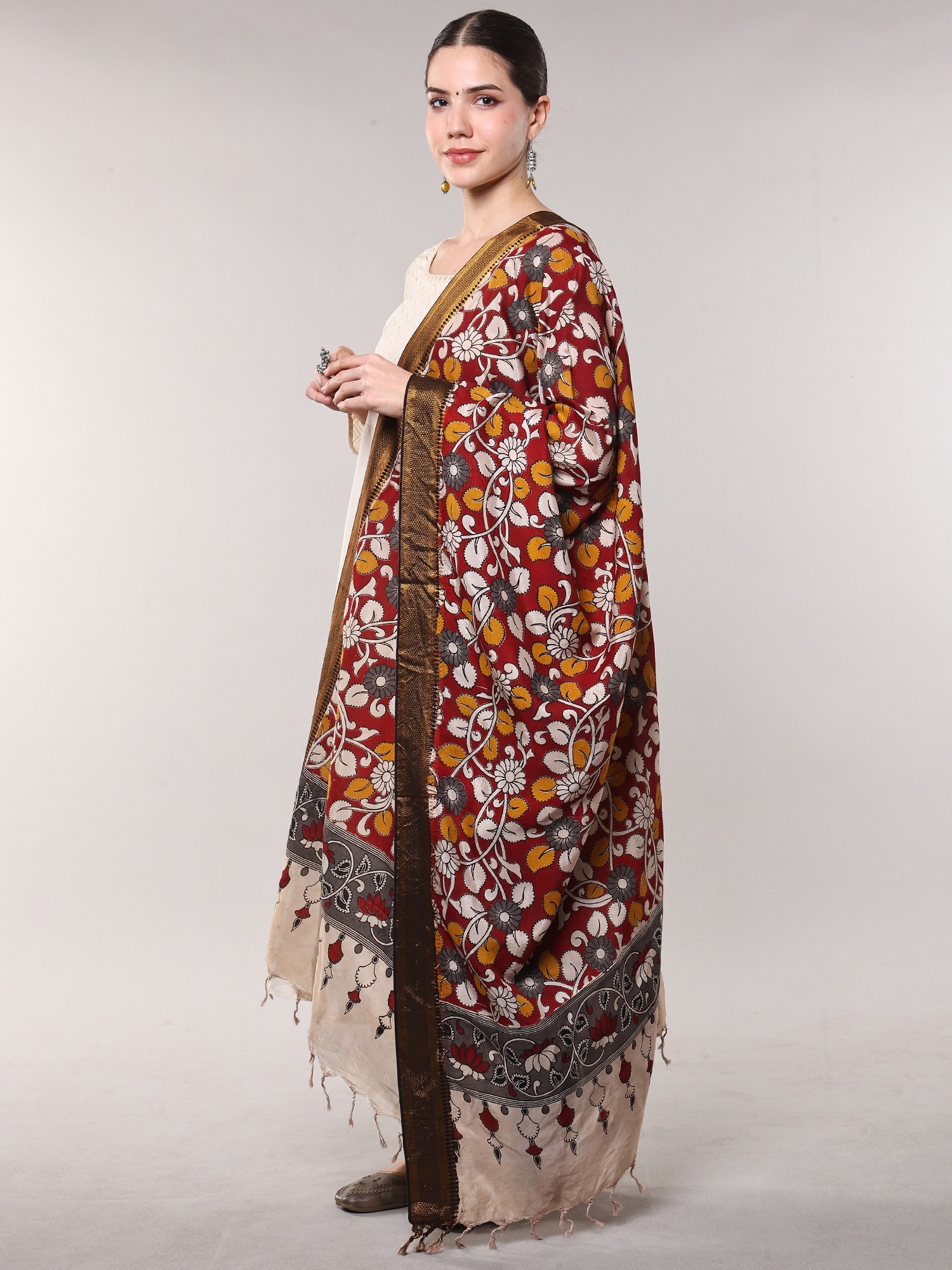 Kalamkari Dupatta with Zari Border and Hand-Painted Lotuses