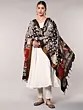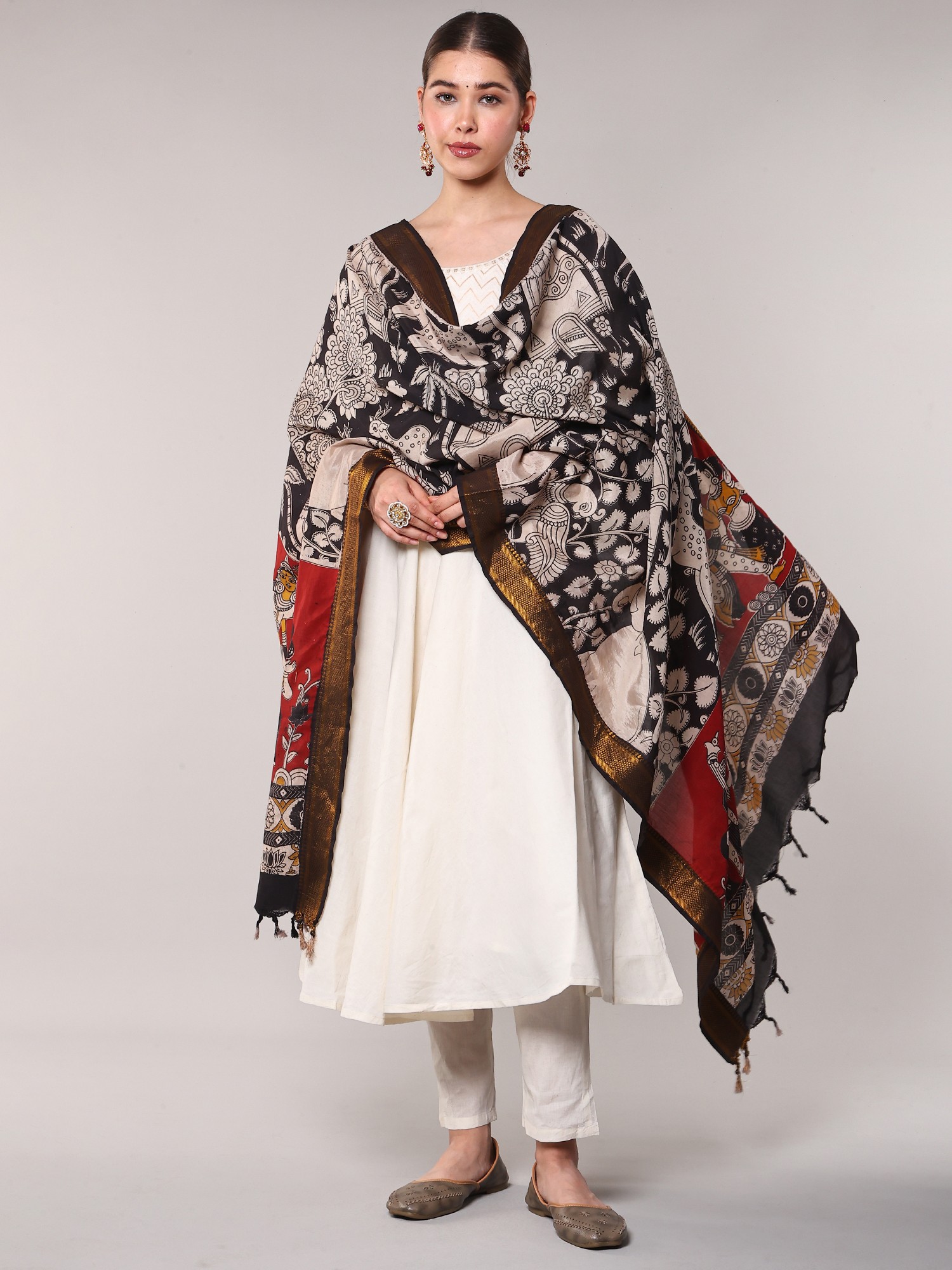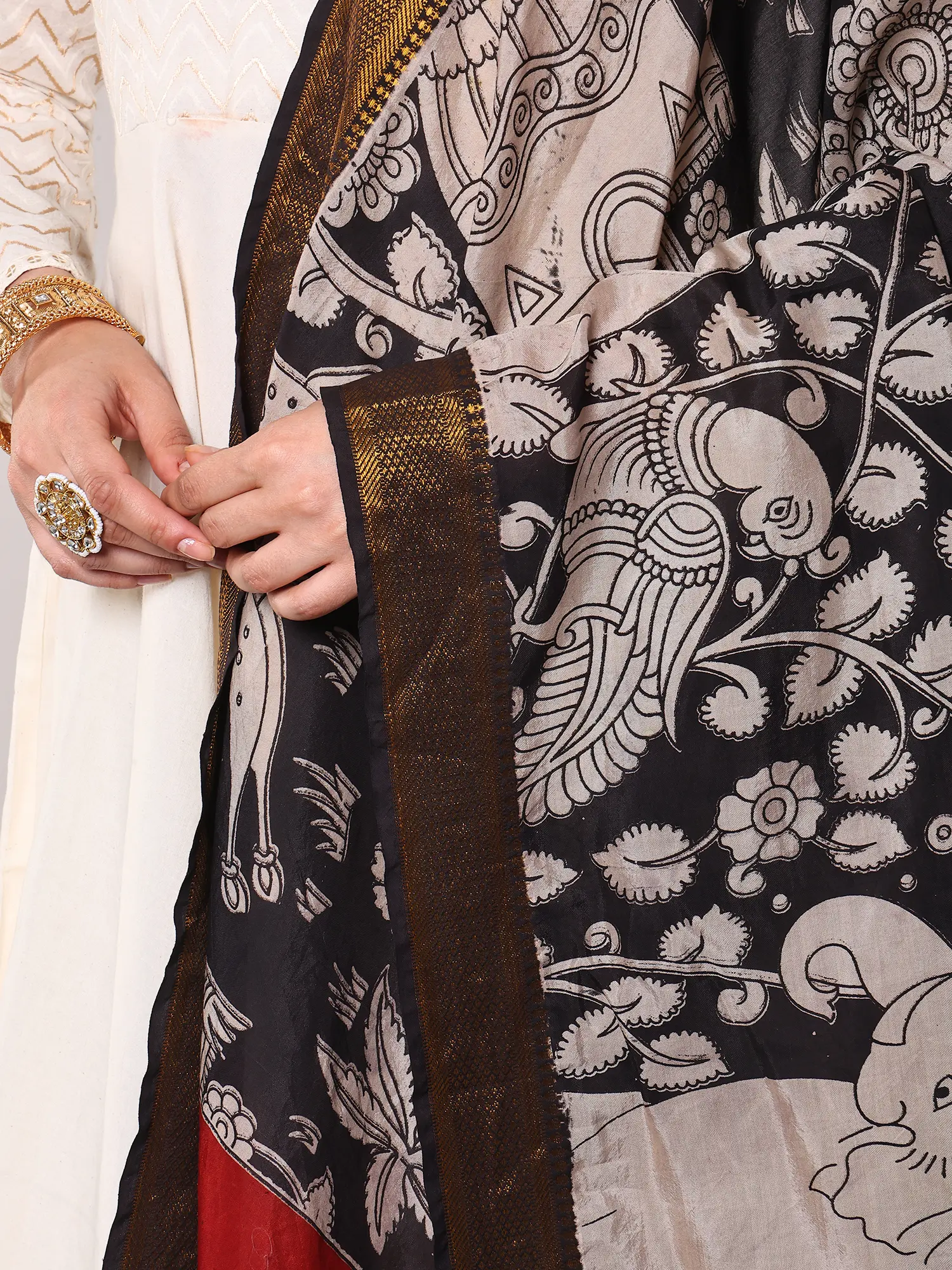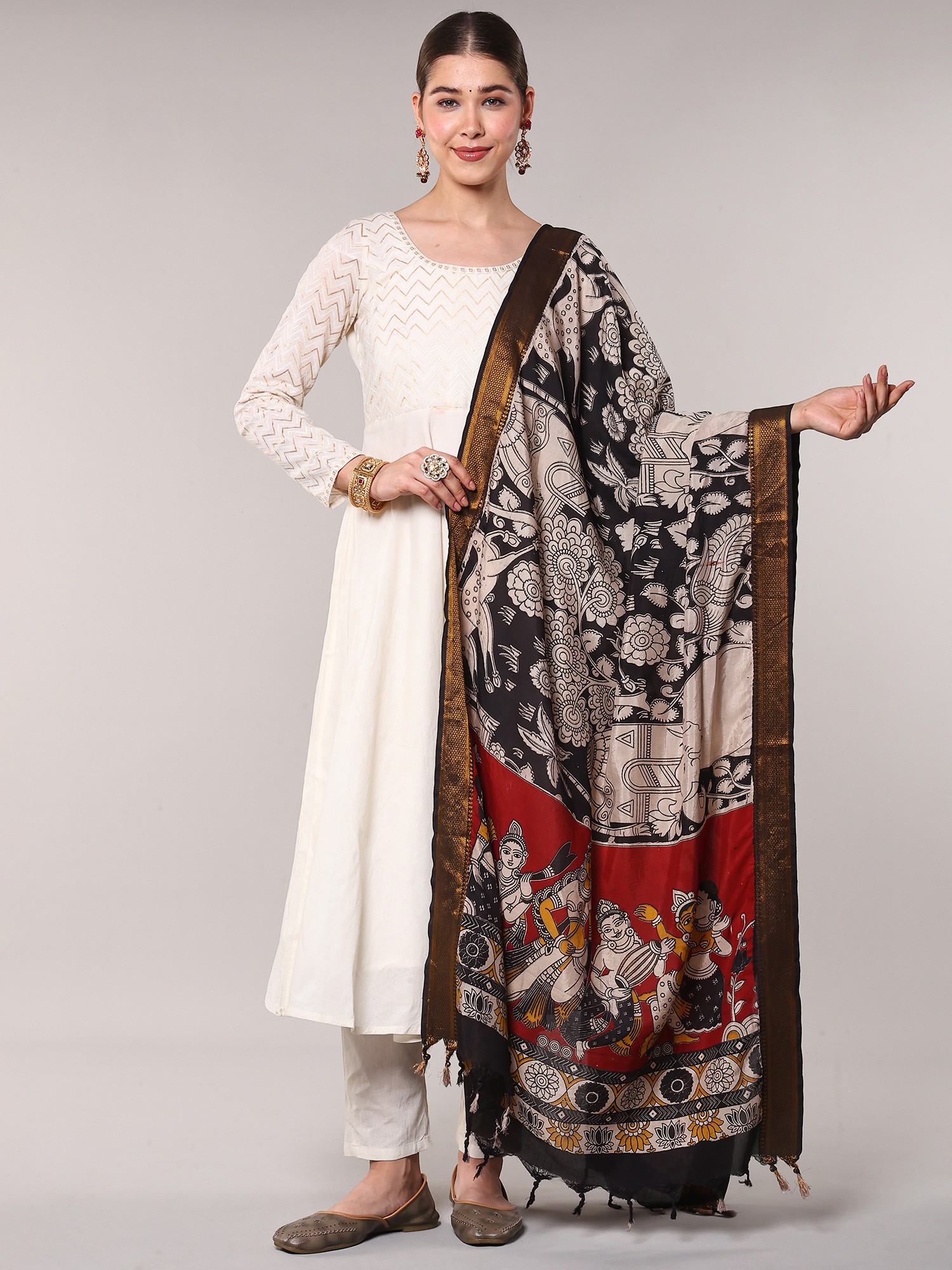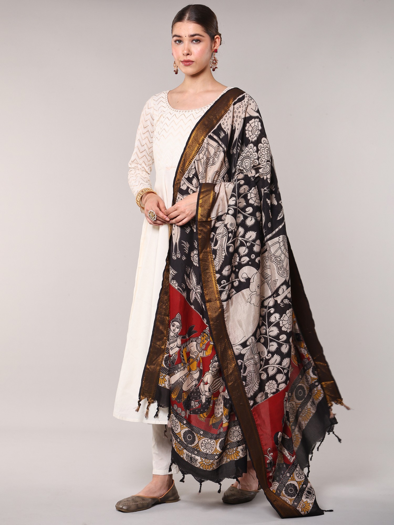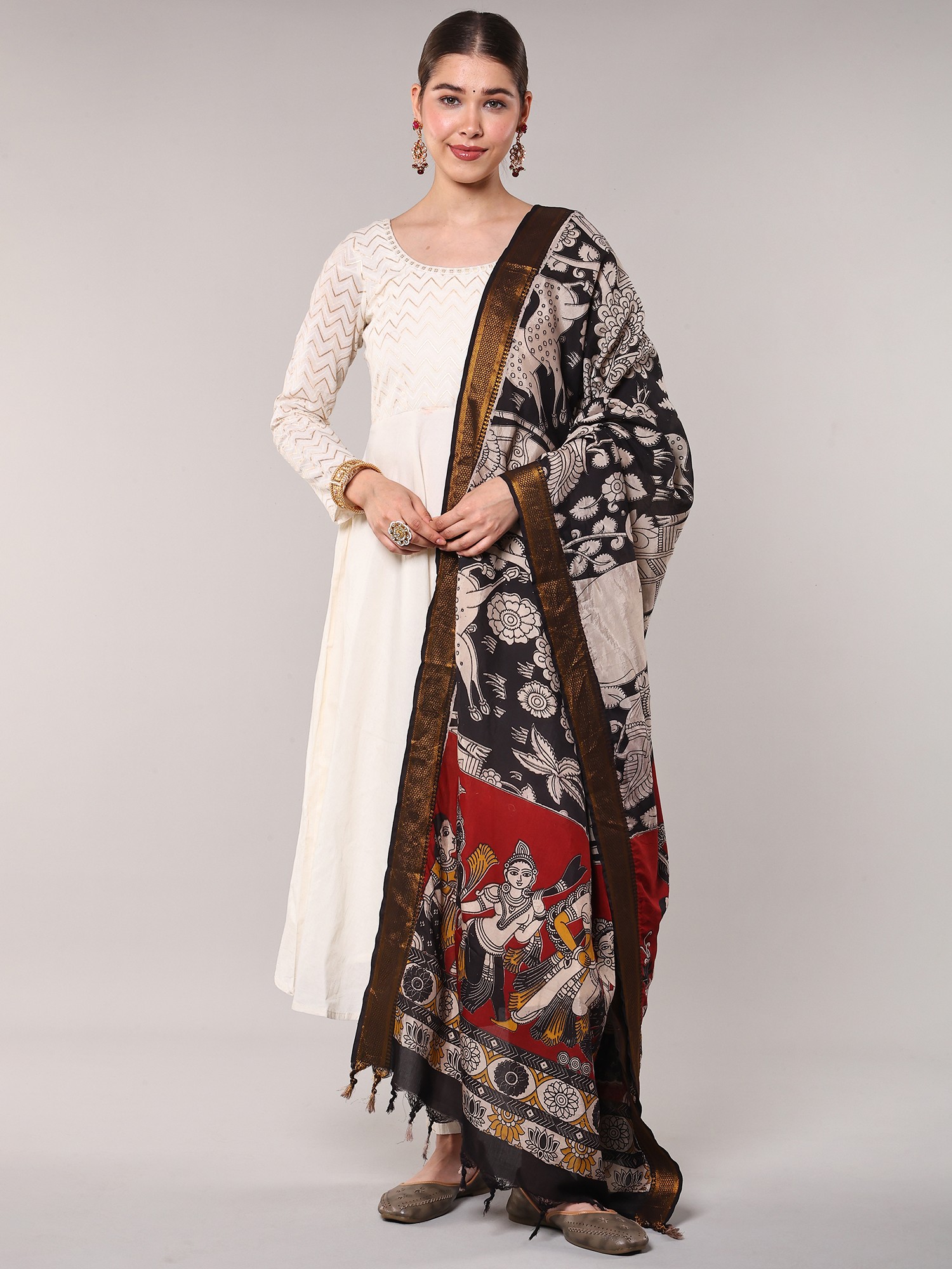 Black-Ink Floral Printed Kalamkari Dupatta from Telangana with Zari Woven Border and Dancing Apsaras