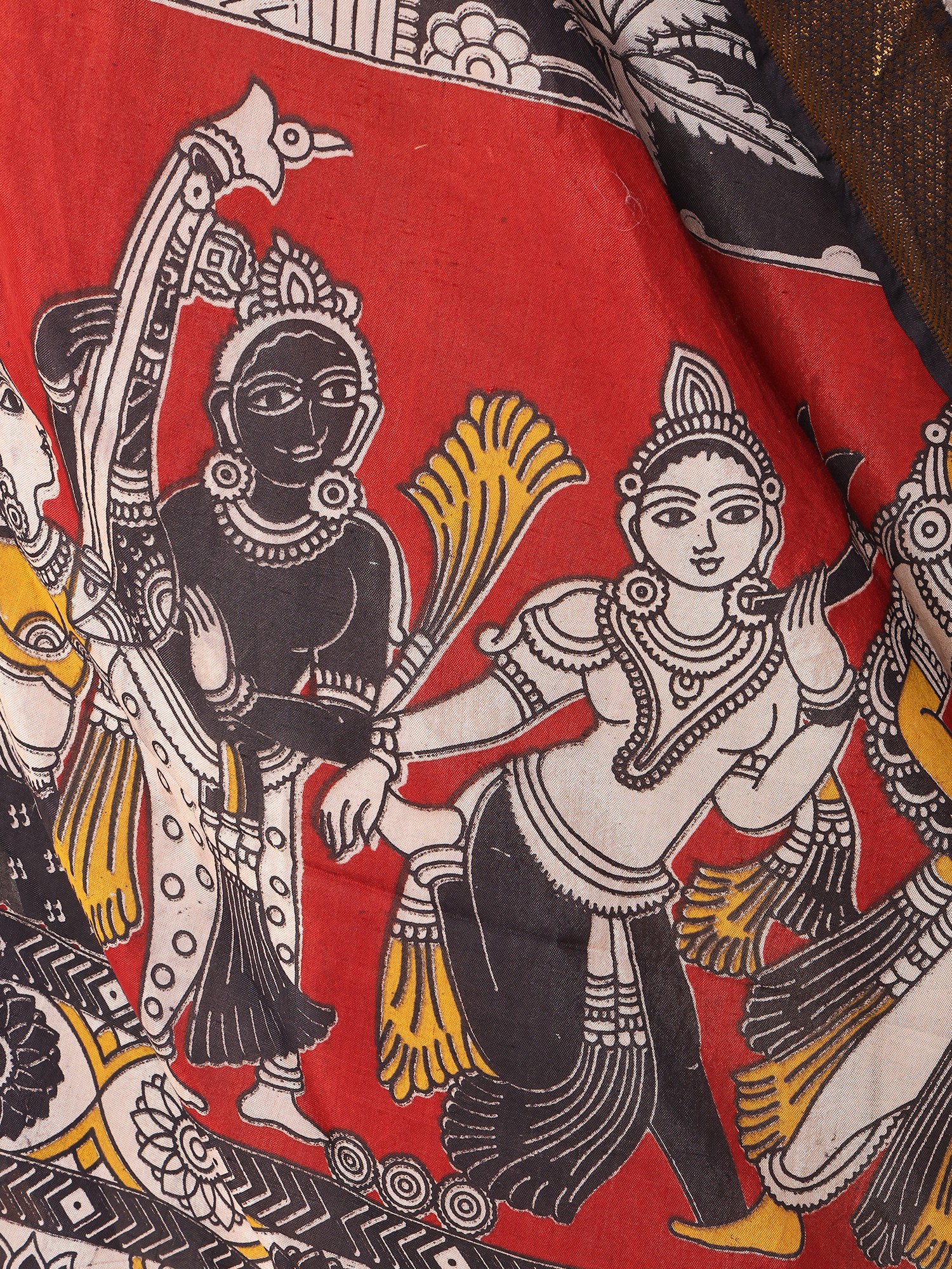 Features a detailed Kalamkari print showcasing a lively jungle scene and a musical group.