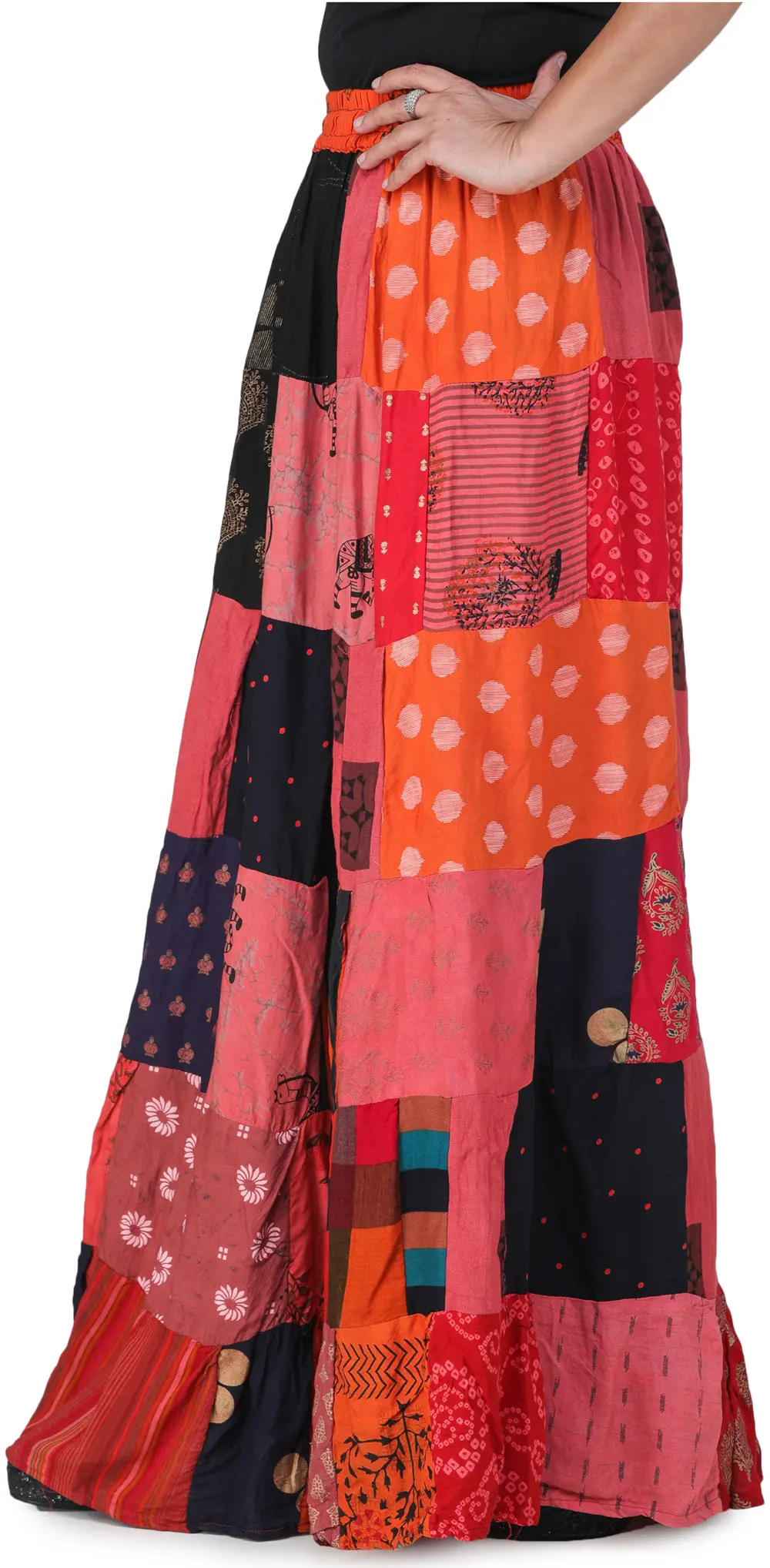 Step into a world of vibrant artistry and free-spirited style with this exquisite long boho skirt. Crafted with a dedication to unique design, each skirt tells a story through its meticulously arranged patchwork. This garment is more than just clothing; it's a wearable piece of art, inspired by the rich textile traditions of Gujarat. The eclectic mix of patterns and colors creates a captivating visual tapestry, making each skirt a one-of-a-kind creation.