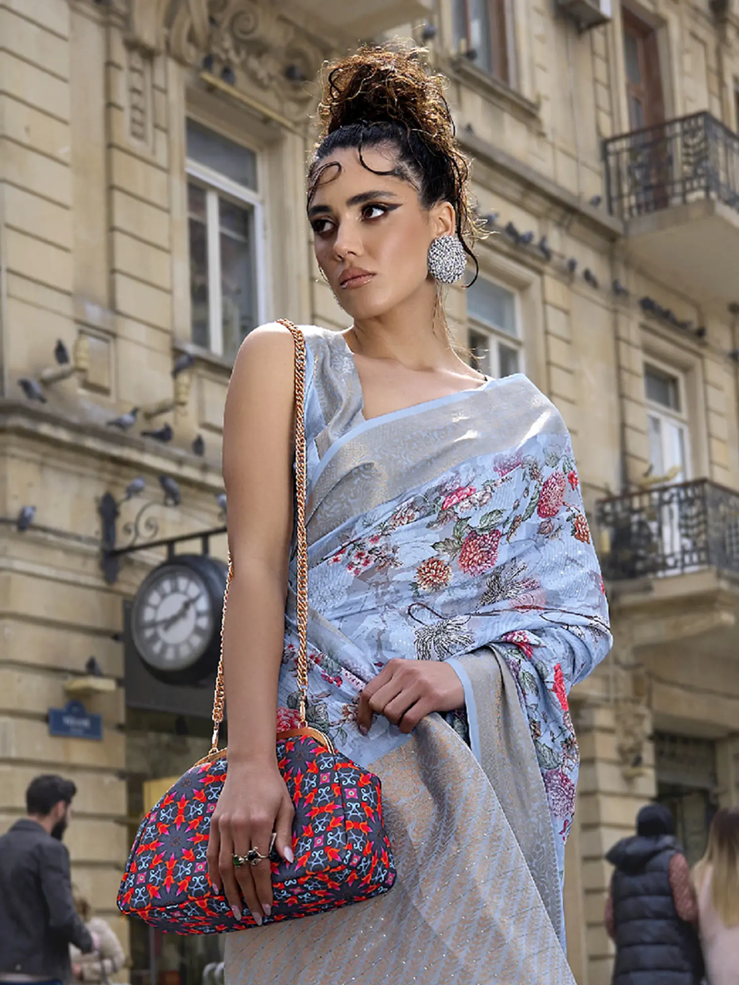 Step into a world of refined elegance with this exquisite handloom saree, a masterpiece woven with passion and tradition. The delicate poly brasso fabric drapes with an ethereal grace, creating a silhouette that is both timeless and contemporary. Its soothing sky-blue base serves as the perfect canvas for a breathtaking display of floral motifs, each bloom rendered with captivating detail. From blushing roses to delicate dahlias, the intricate patterns are a celebration of nature's artistry, bringing a vibrant yet serene charm to the garment.