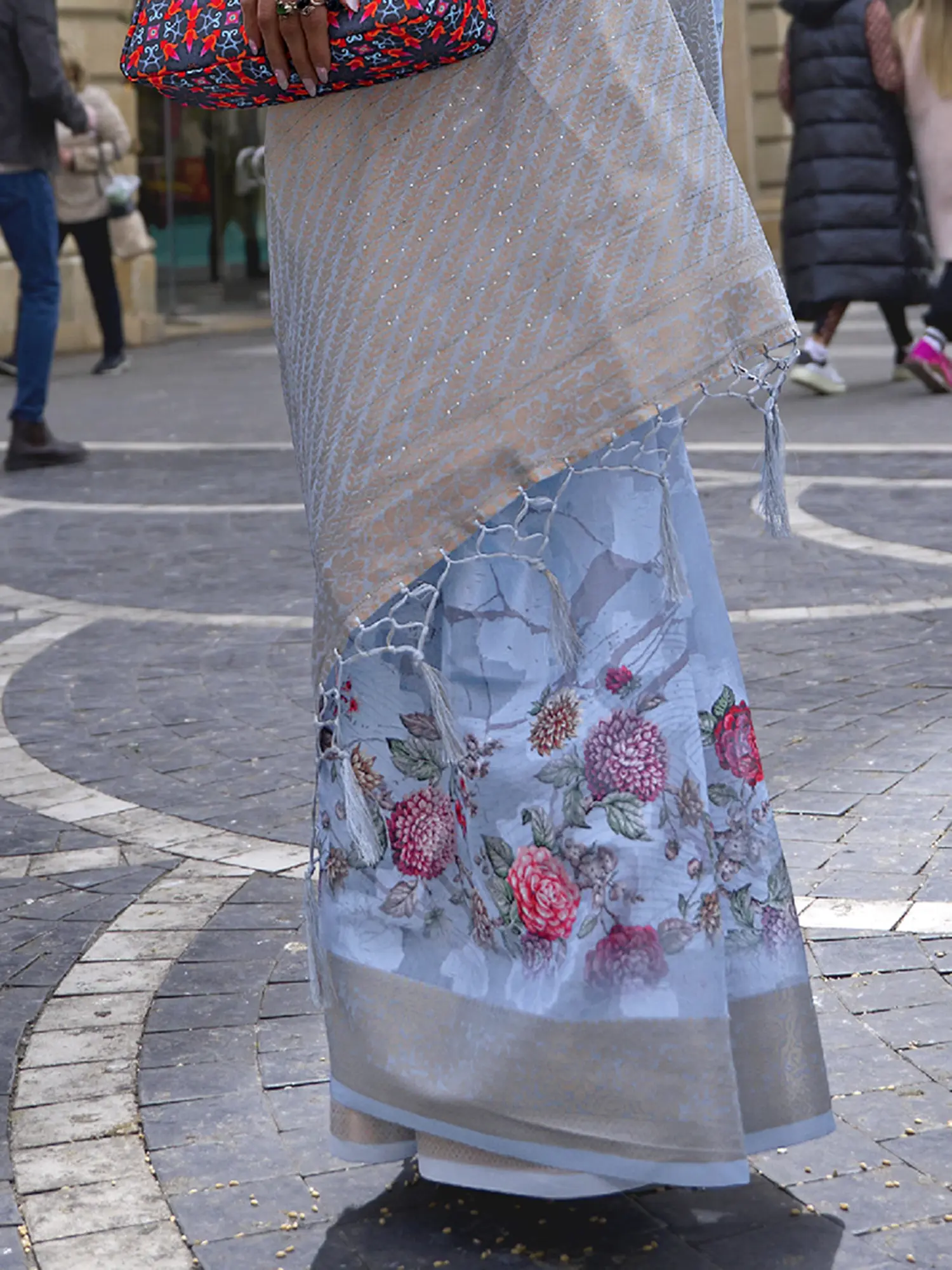 Lilac-Gray Saree with All-Over Floral Print and Tasseled Pallu