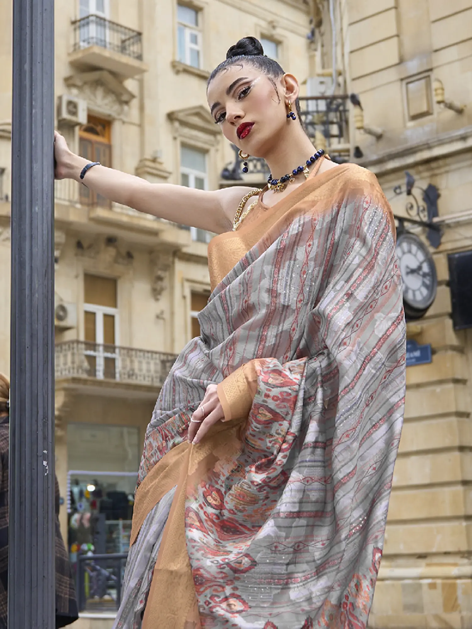 The saree is adorned with a captivating print that dances across the fabric in a symphony of colors. Delicate lines and motifs intertwine, creating a visual narrative that is both contemporary and timeless. The color palette is thoughtfully curated, blending soft, earthy tones with pops of vibrant coral and subtle silver threads, giving the saree a luminous glow. Each pattern is rendered with precision, showcasing the skill of the weavers and printers. This intricate detailing transforms the saree into a statement piece, perfect for those who appreciate nuanced beauty and artistic expression.