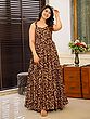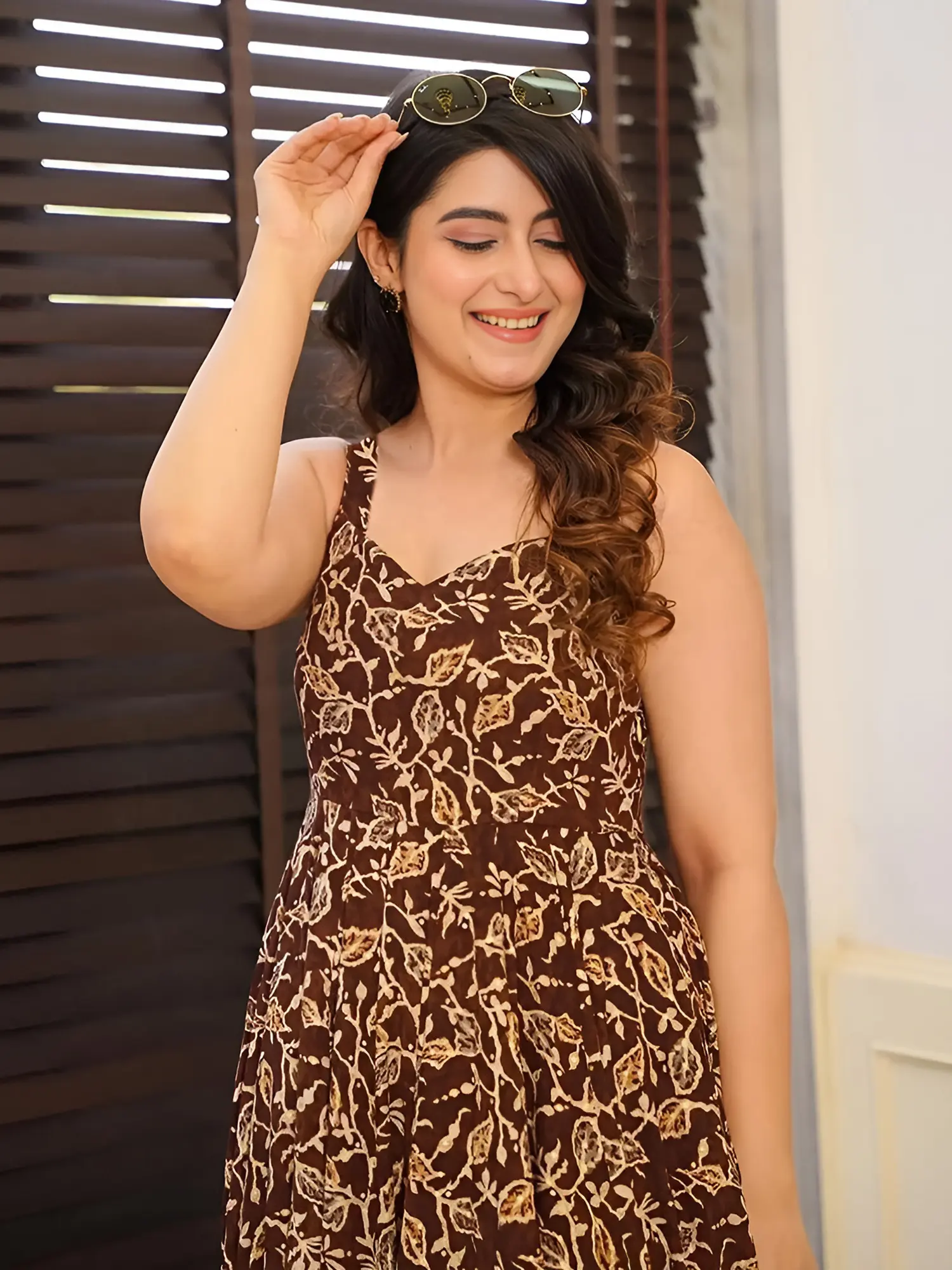 Discover the epitome of relaxed elegance with this stunning printed rayon maxi dress. Designed for the modern woman who appreciates both comfort and chic style, this sleeveless gown is your perfect companion for a variety of occasions. The rich, earthy brown hue is beautifully adorned with a delicate, all-over print that adds a touch of bohemian charm to your ensemble. Whether you're planning a sun-drenched brunch with friends, embarking on a weekend getaway, or simply running errands around town, this dress offers a graceful and fashionable solution.