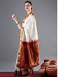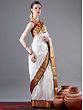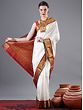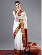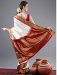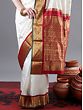 Snowy white and beautified by traditional Indian hues, this silk Kanjivaram saree is a timeless gem from Tamil Nadu for your wardrobe. The field of the saree is ornamented with tiny Butis and outlined by a thick red border. On the pallu of the saree are ethnic patterns, created using glimmering golden threads, which lends this saree a regal appeal.