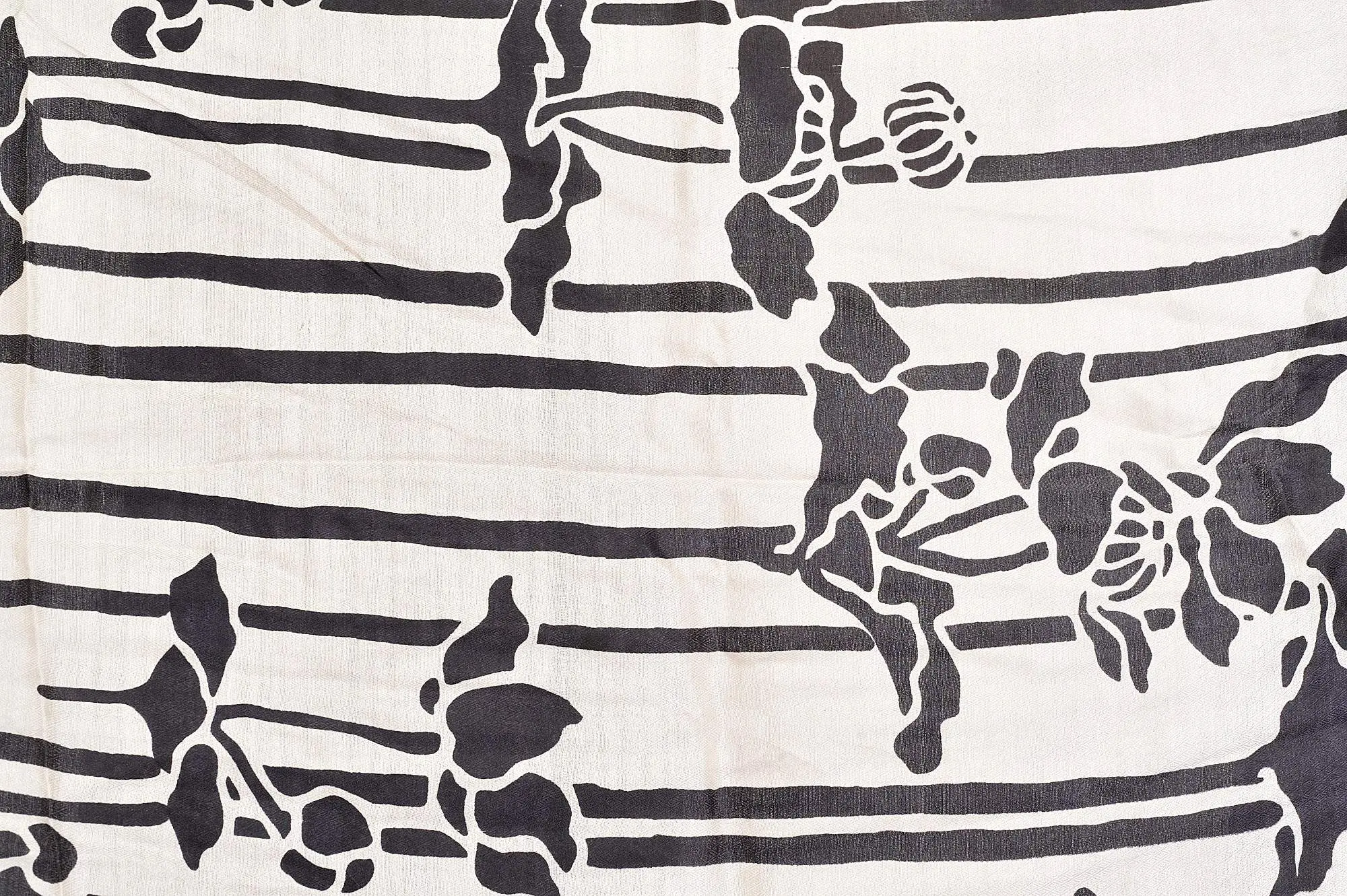 The stole's pristine white canvas is artfully adorned with striking black printed motifs. These abstract botanical designs create a captivating visual contrast, adding a touch of drama and artistic flair. The patterns are strategically placed, appearing both dynamic and elegantly balanced across the expanse of the fabric. Complementing the prints are fine horizontal black stripes that add a subtle graphic element, ensuring the design remains modern and chic. The interplay of stripes and organic forms lends a unique depth and character to this versatile accessory.