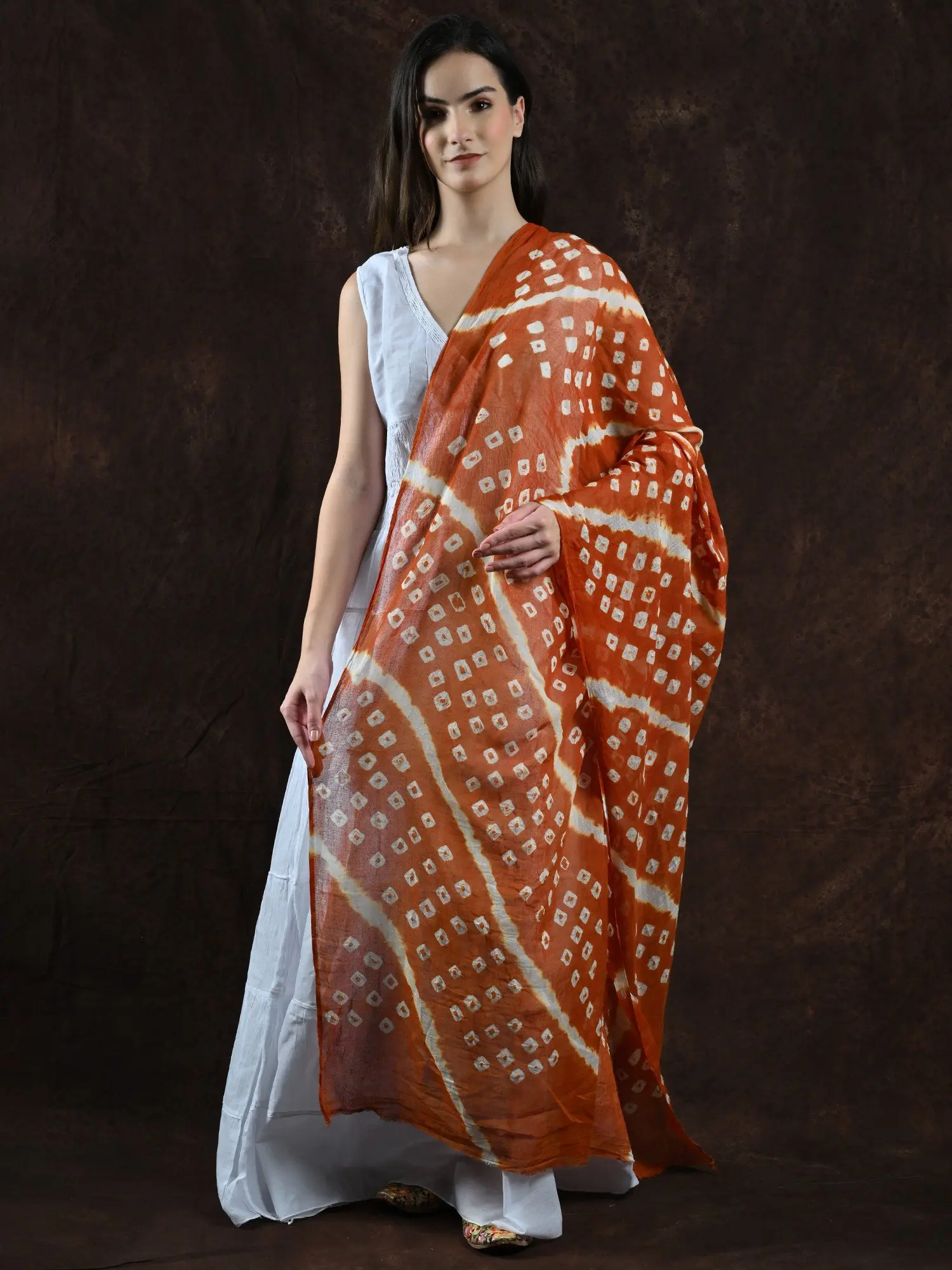 The generous size of this dupatta makes it incredibly versatile. Drape it over your shoulders for a classic, elegant look with traditional Indian attire like kurtis and salwar kameez. Its light weight and soft texture also make it a perfect companion for more contemporary styles, adding a bohemian touch to western wear, or simply acting as a chic scarf. The intricate Bandhani and Leheria patterns are sure to draw admiration, sparking conversations about its artisanal origins. It's an ideal accessory for festivals, weddings, casual outings, or simply when you want to feel connected to India's vibrant textile traditions. Own a piece of living history and celebrate the beauty of handcrafted artistry.