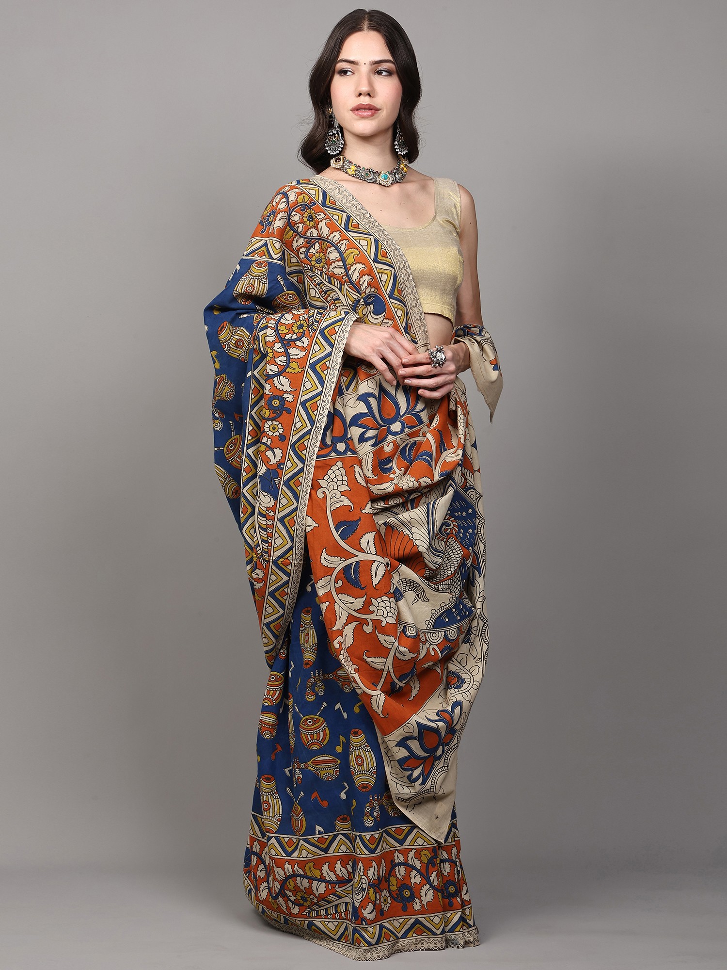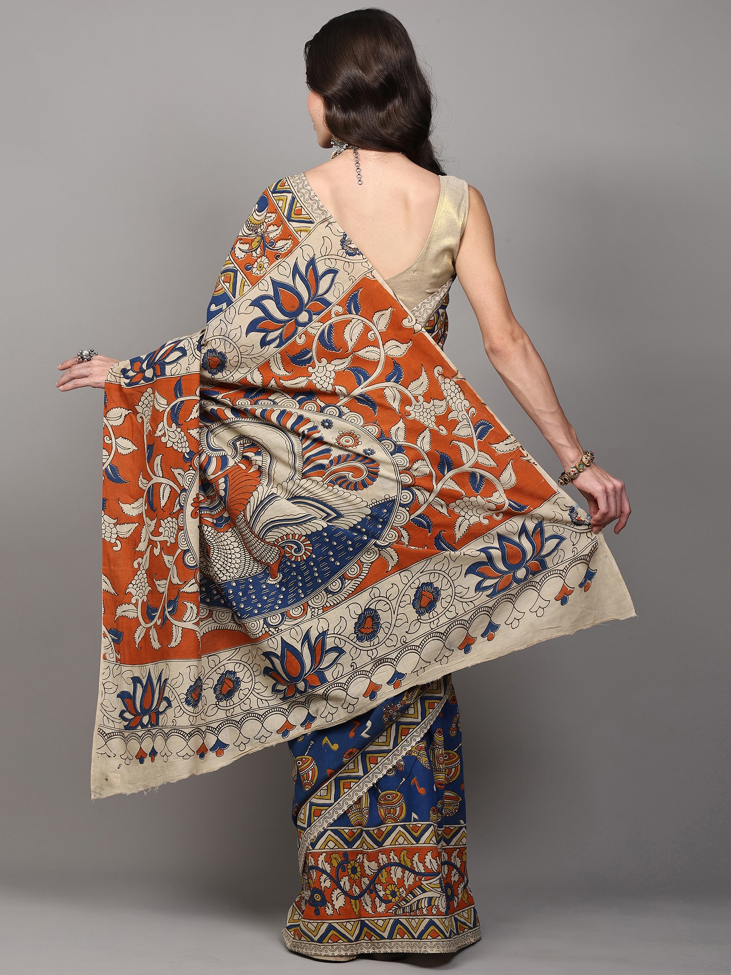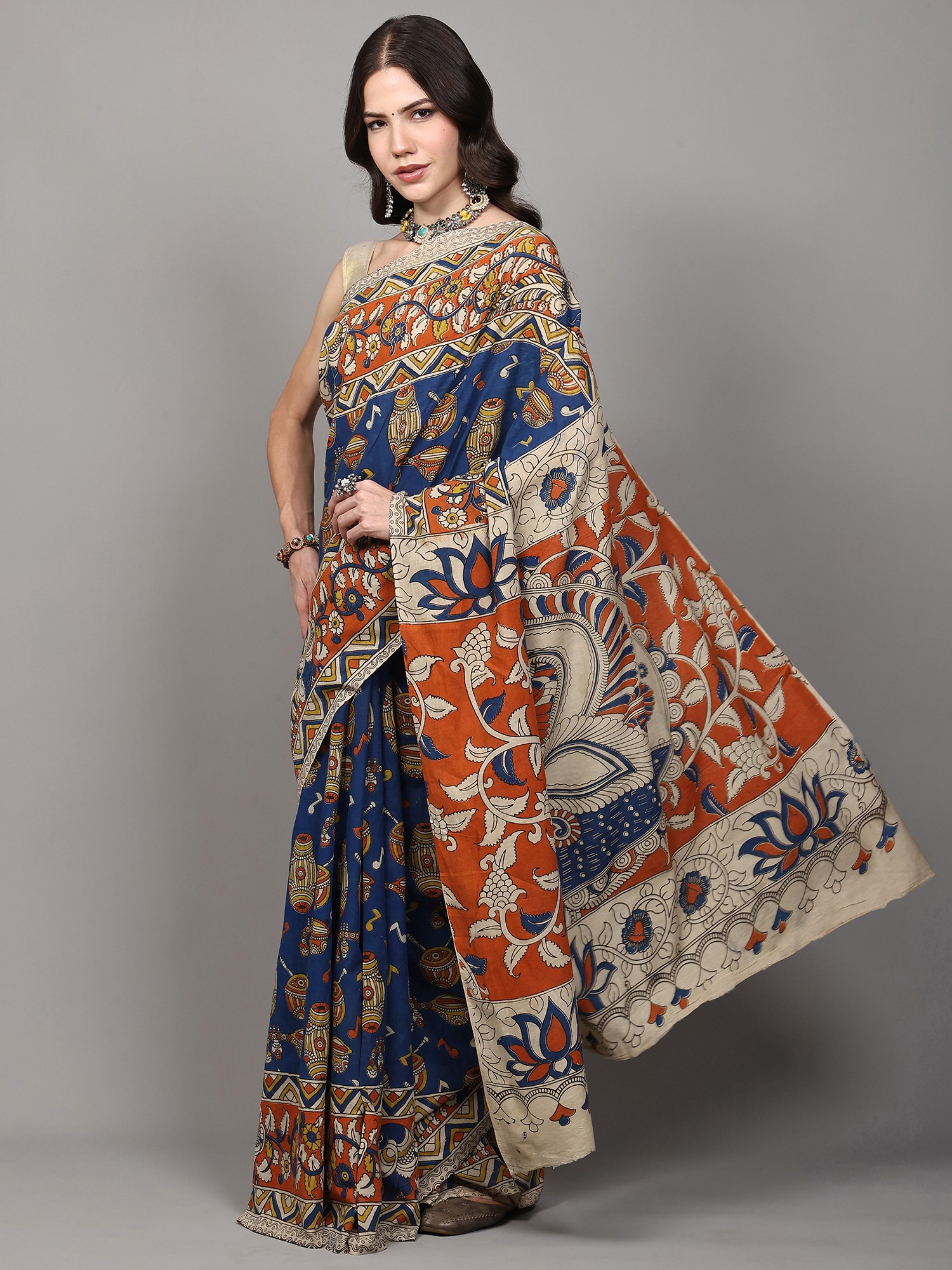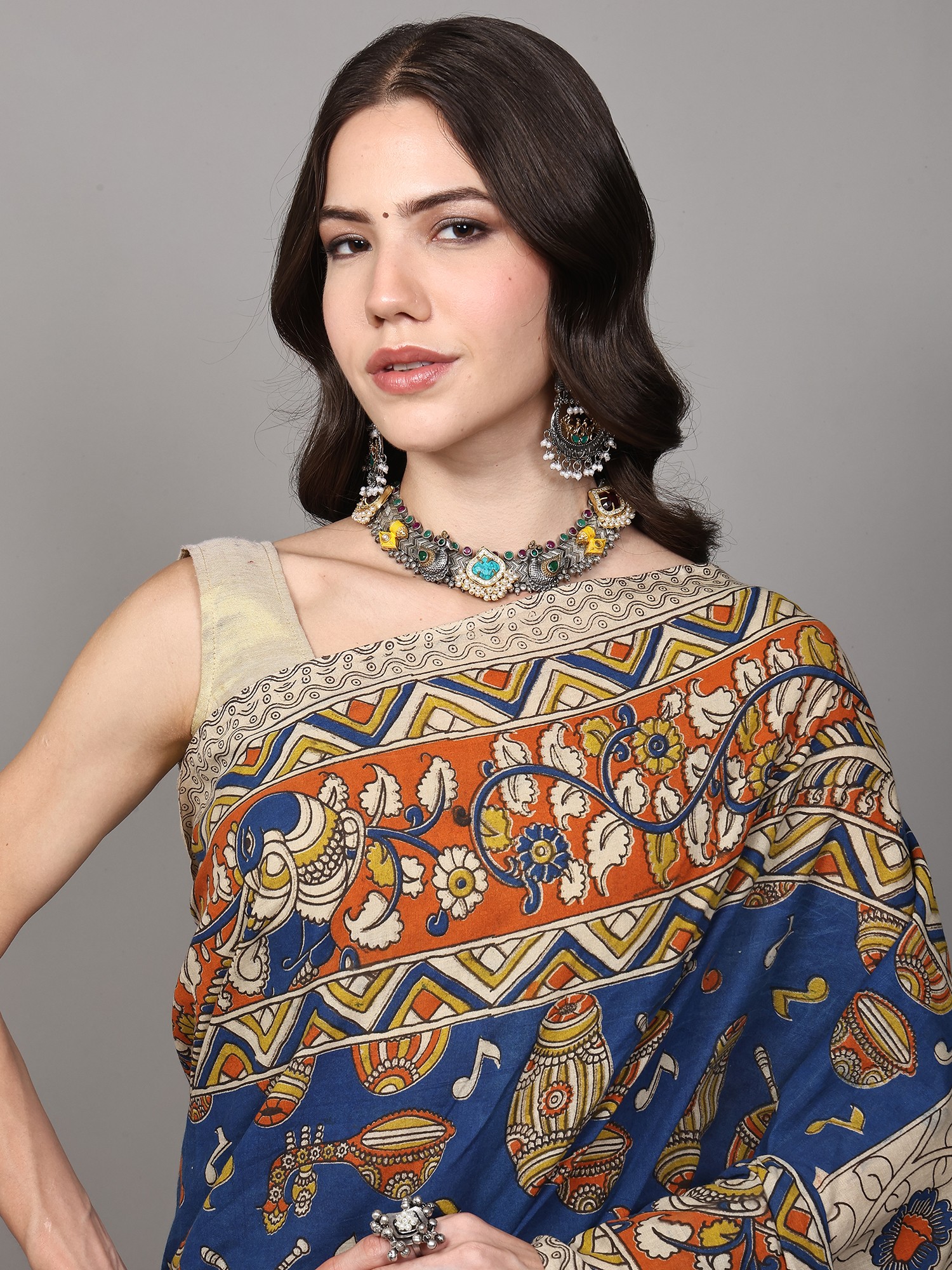 The Gray-Sand Hand-Painted Kalamkari Sari is a fusion of tradition and artistry that captures India's rich culture. Its deep, enchanting hues create a captivating canvas for an array of motifs. From Indian musical instruments to delicate floral-peacock patterns, this saree is a visual symphony of tradition and creativity. Each motif tells a story, crafting a tapestry of India's cultural heritage. Perfect for lovers of fusion in traditional styles, this sari is not just clothing; it's a remembrance of a vibrant and diverse culture, allowing you to drape yourself in the essence of India's artistic legacy and timeless elegance.