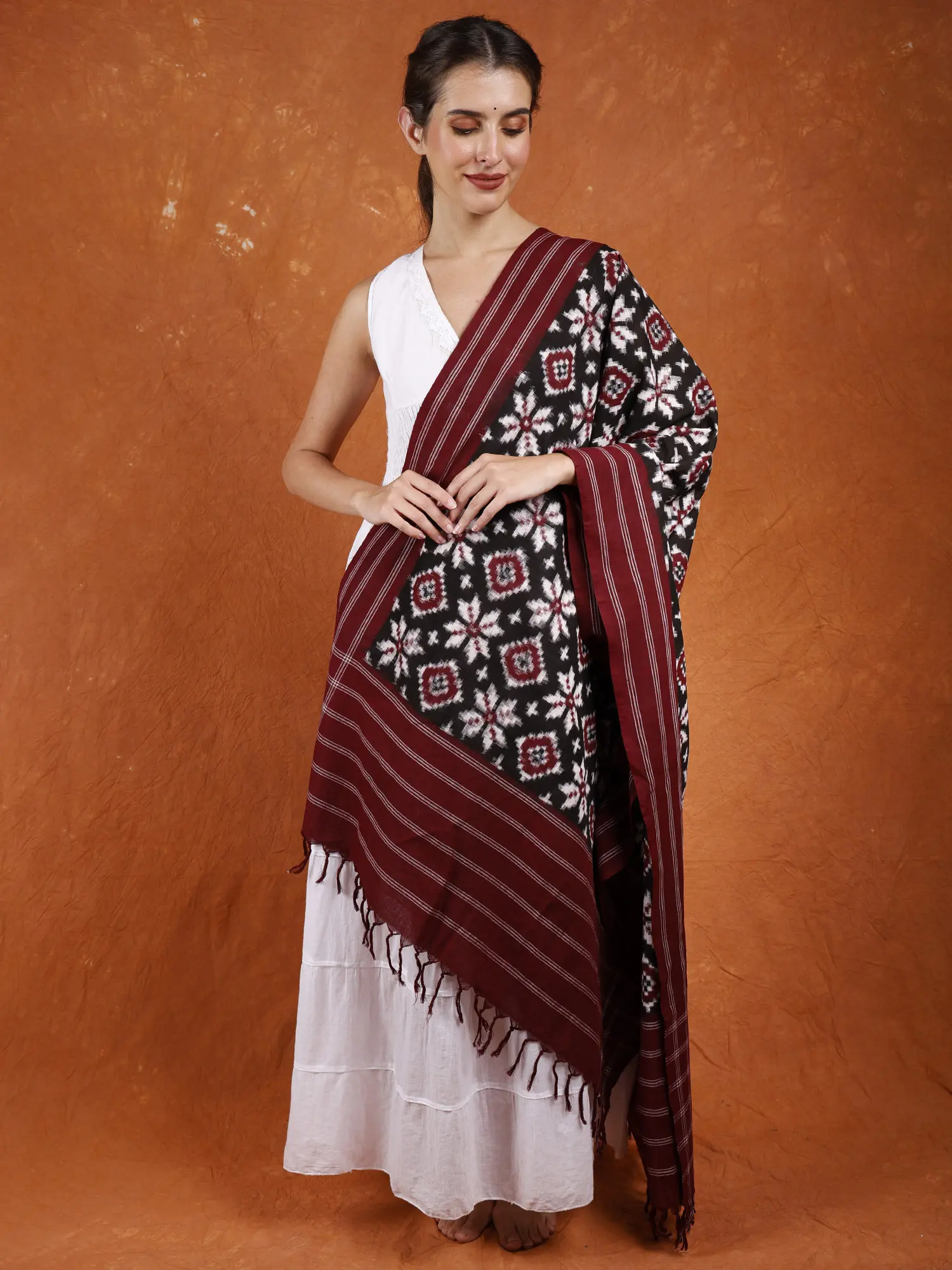 The intricate double ikat weave means that both the warp and weft threads are resist-dyed before weaving, allowing for the creation of complex and symmetrical patterns that appear on both sides of the fabric with remarkable clarity. The bold, diamond-shaped central motifs, interspersed with floral-like elements in contrasting black and white, are rendered with exceptional precision. The border of the dupatta is a study in complementary design, featuring a series of fine, parallel maroon stripes punctuated by wider bands that echo the central pattern's color palette. This thoughtful detailing adds depth and visual interest, ensuring the dupatta is a captivating accessory from every angle. ––––––––––––––––––––