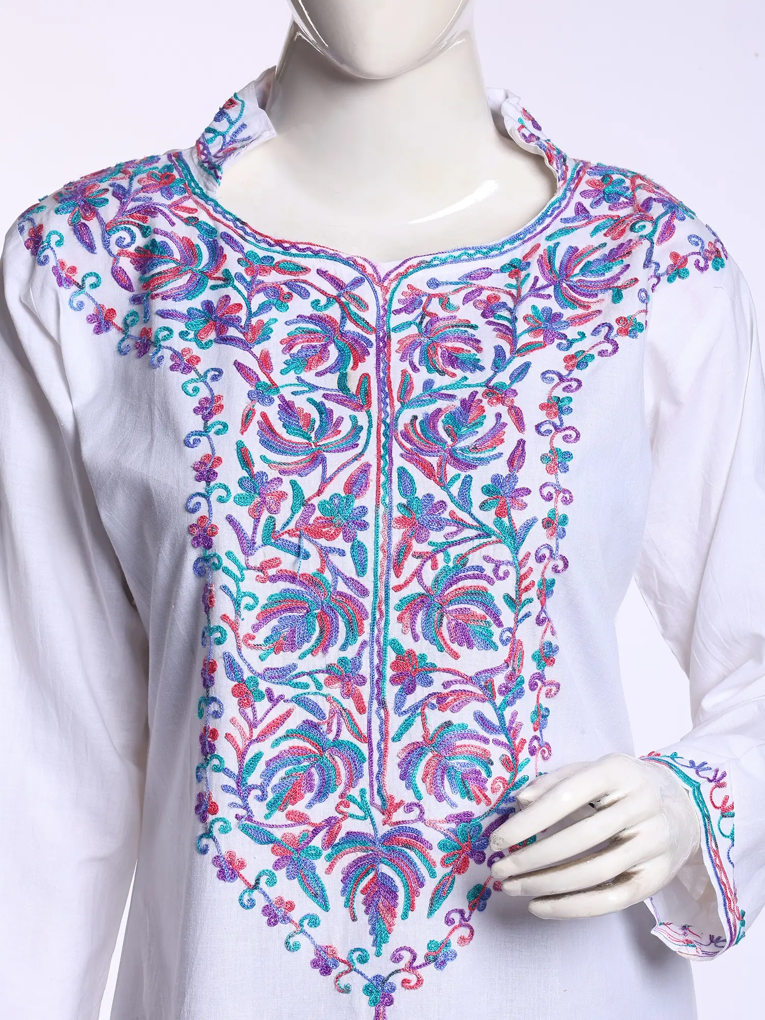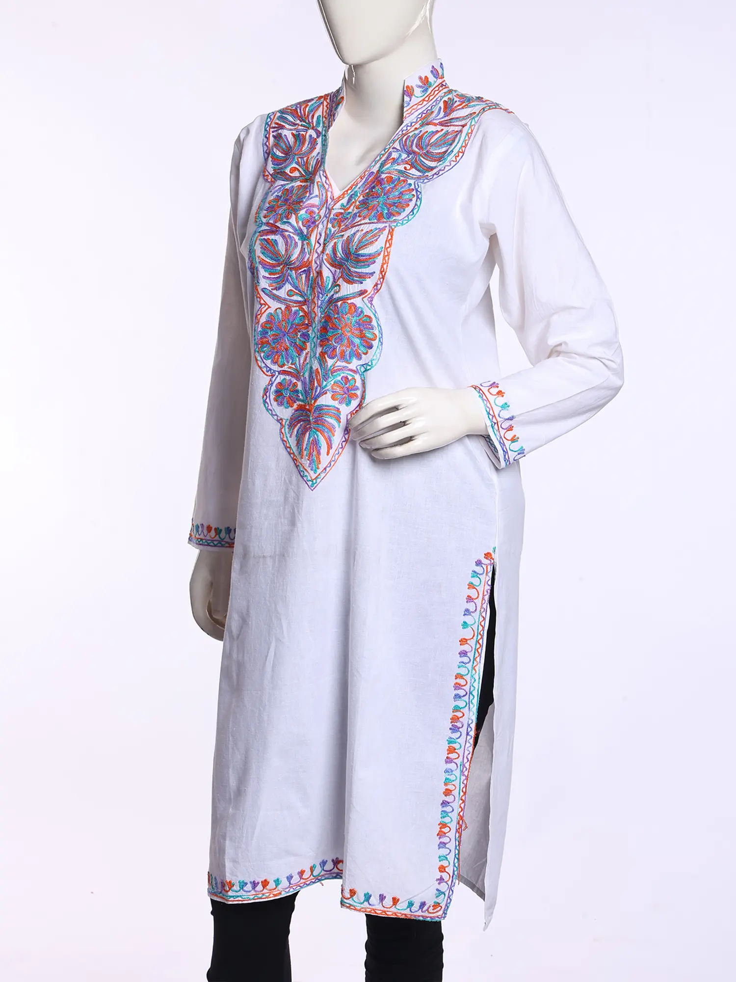 Plain Long Kurti from Kashmir with Aari Hand-Embroidery on Neck