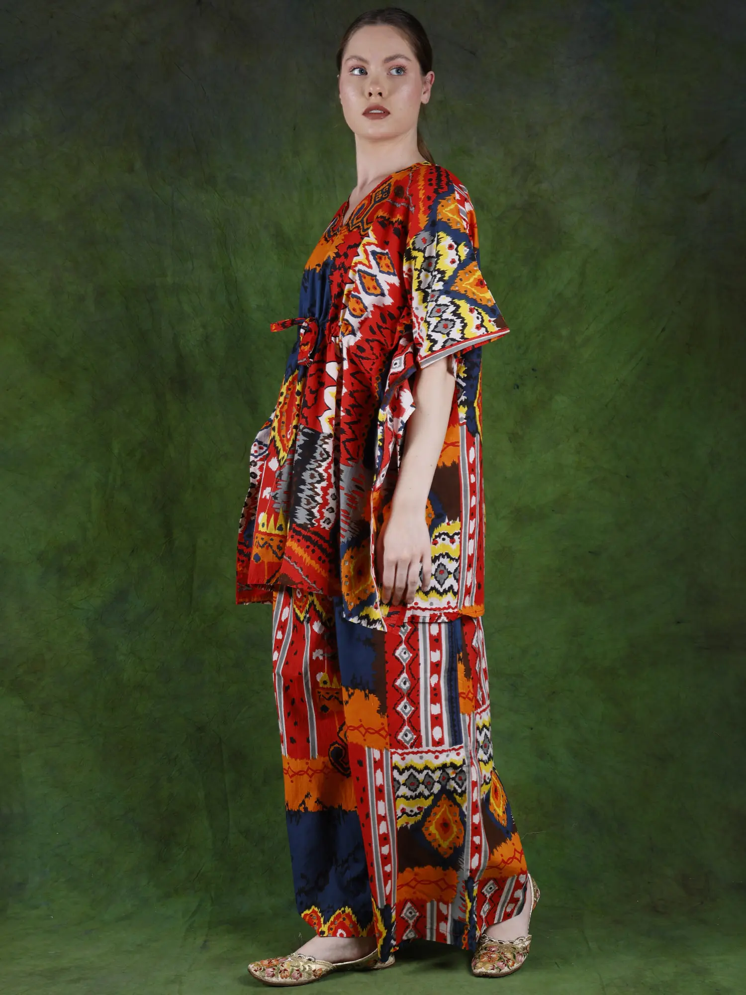River-Blue Kaftan Style Pure Cotton Co-Ord Set with Printed Flowers