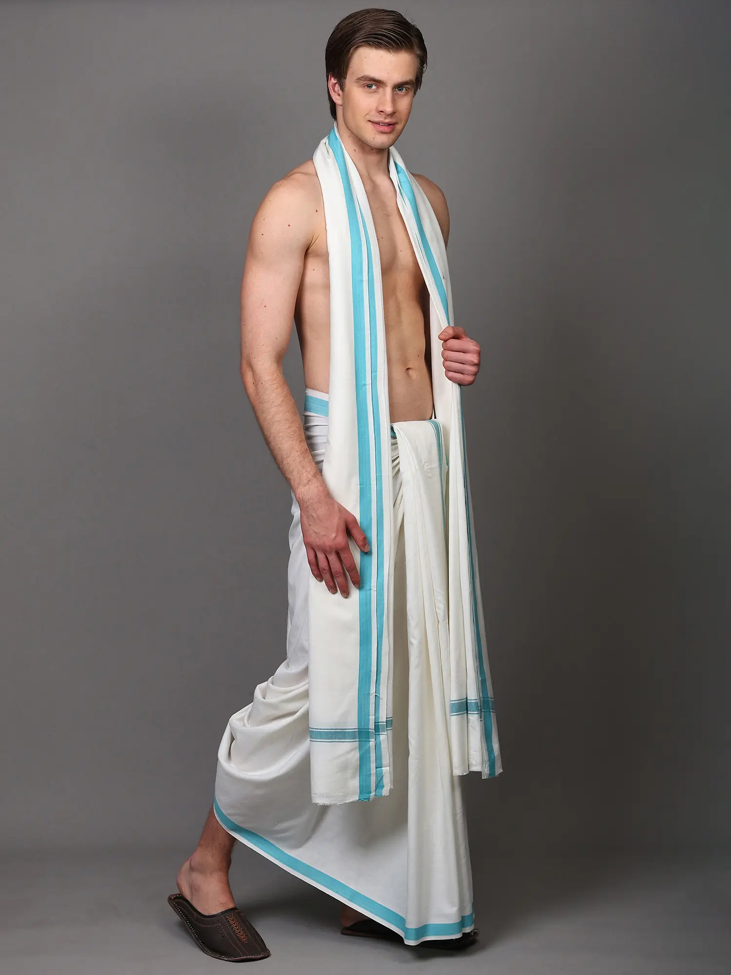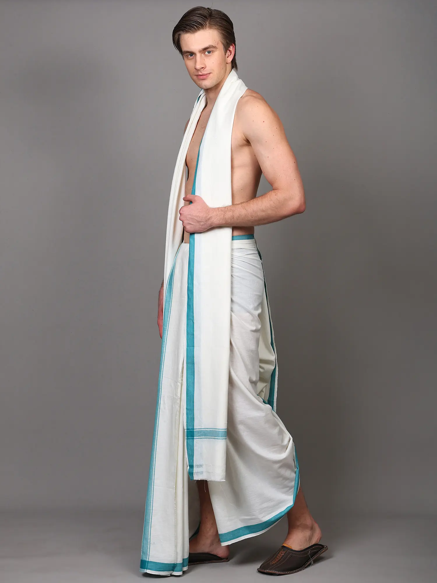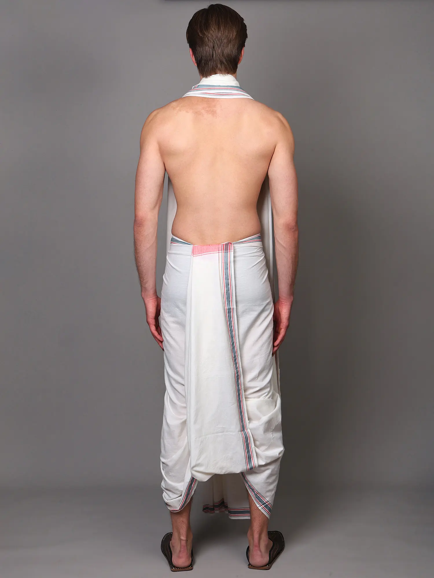Off-White Plain Drape Dhoti and Angavastram Set with Striped Border