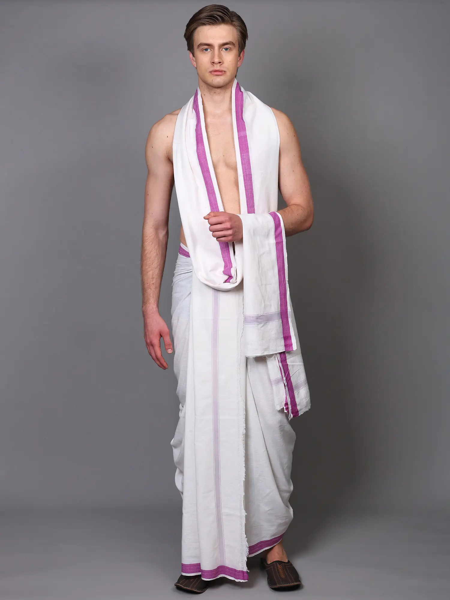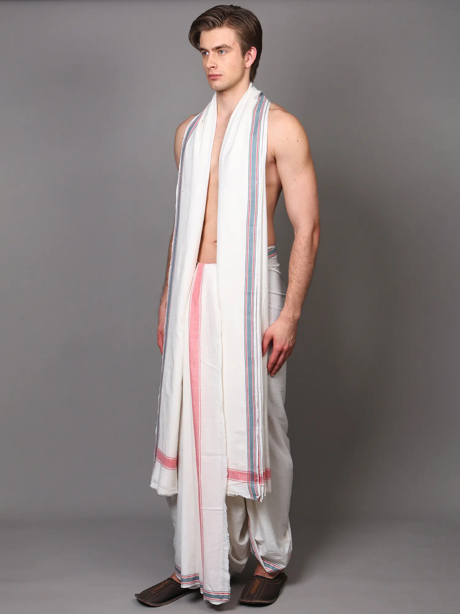 Plain Dhoti and Angavastram Set with Multi Striped Border