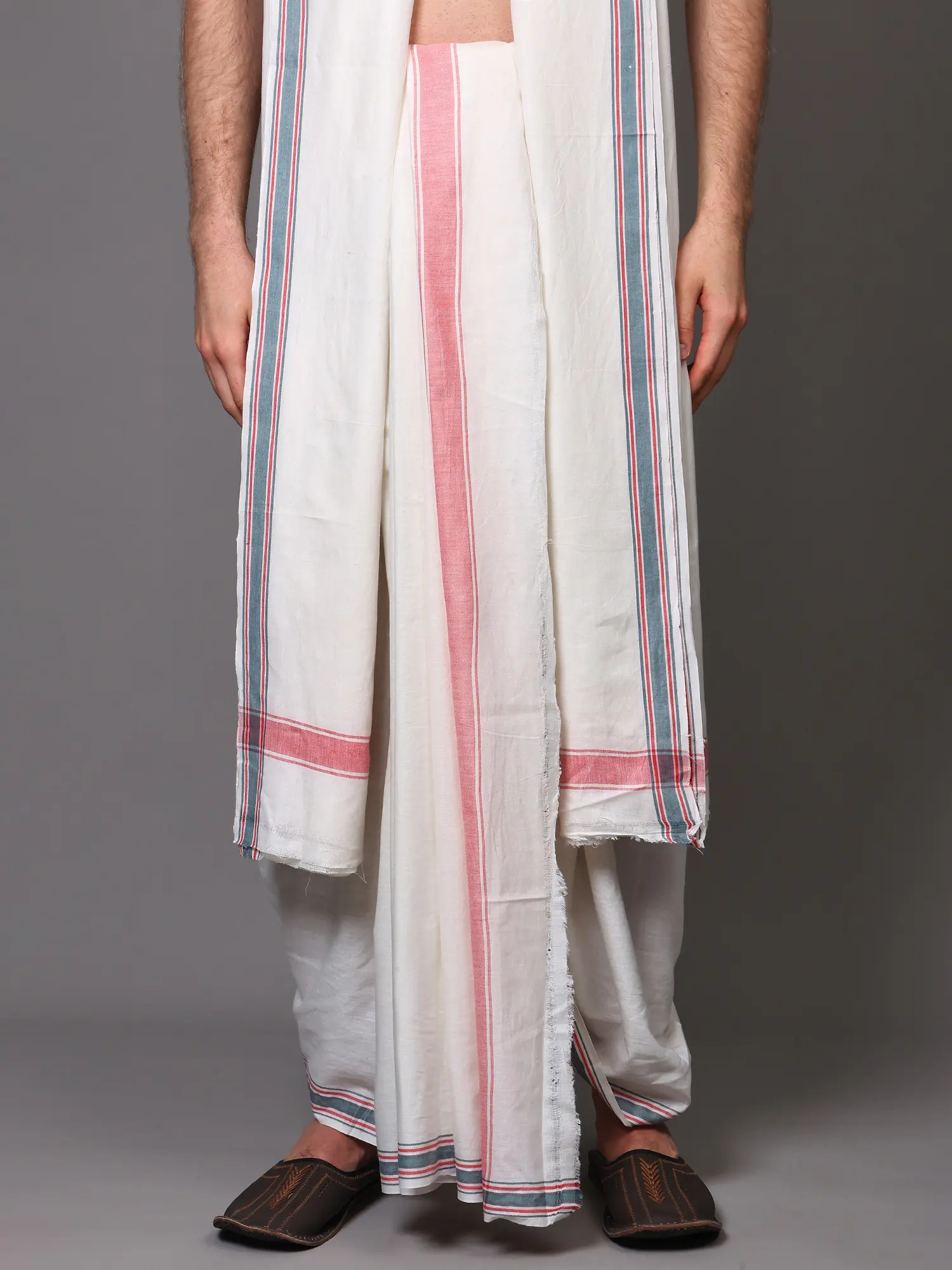 Pure Cotton Plain Dhoti and Angavastram Set with Striped Border from ISKCON Vrindavan by BLISS