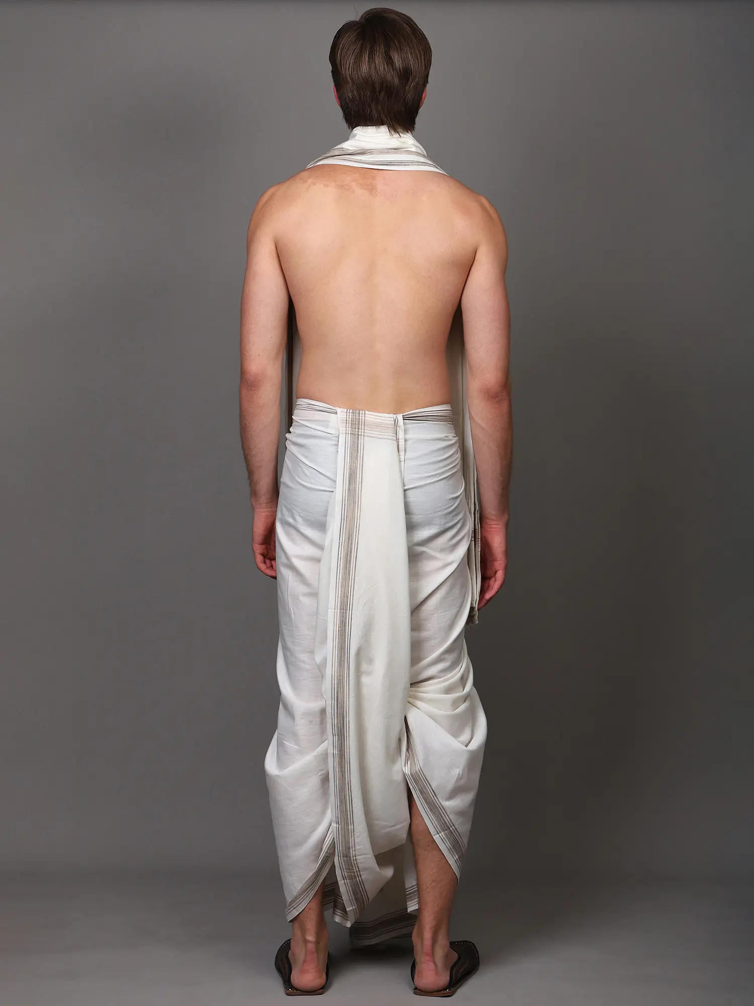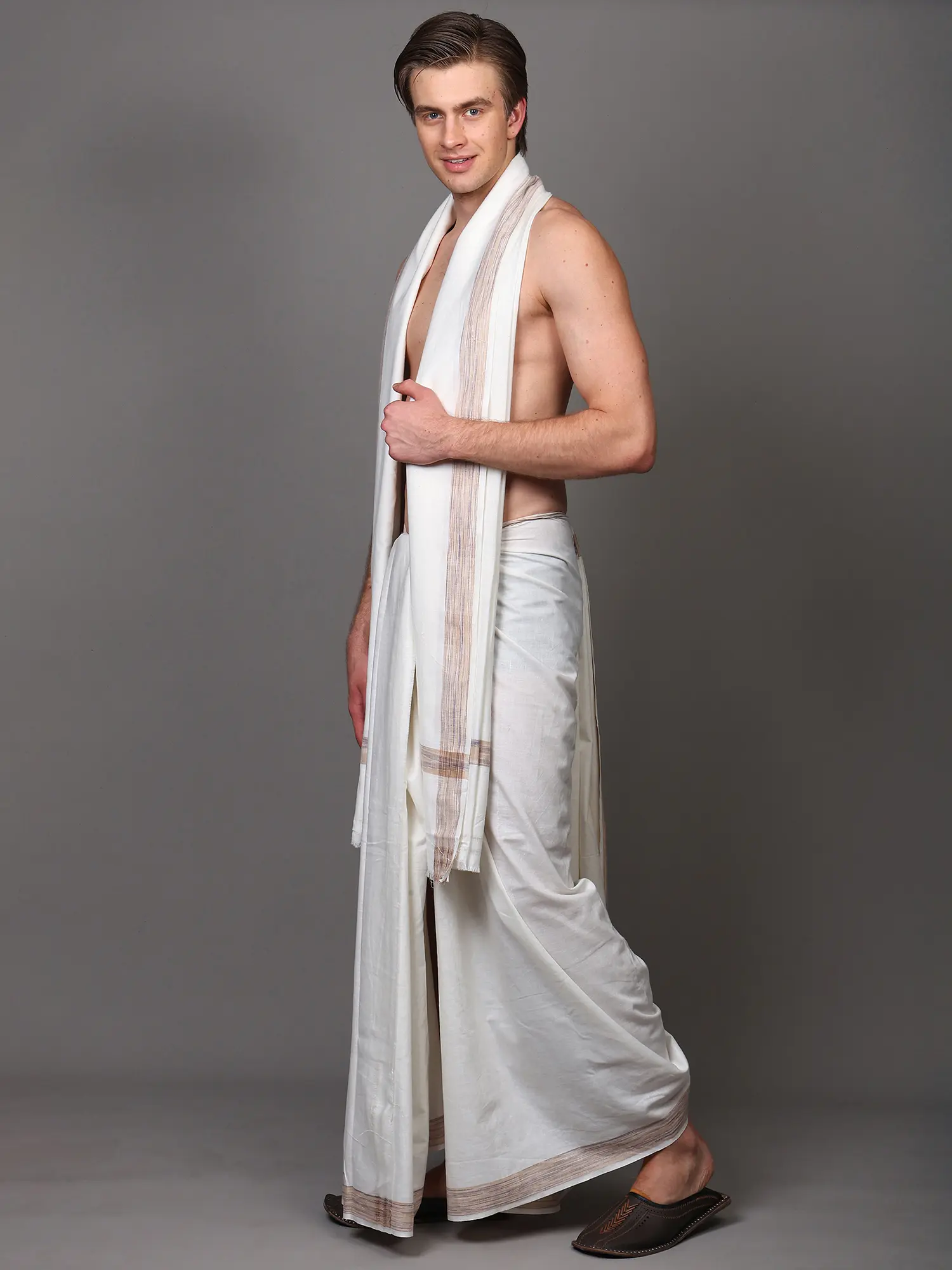 Off-White Plain Drape Dhoti and Angavastram Set with Striped Border