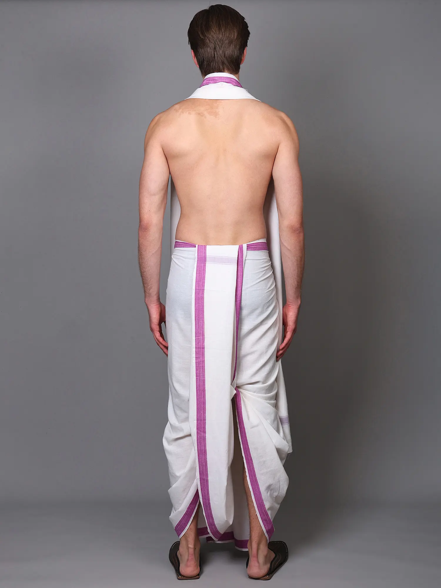 This set is more than just clothing; it's an experience. Whether you are attending religious ceremonies, cultural gatherings, festivals, or simply seeking to infuse your daily wardrobe with a touch of traditional charm, this dhoti and angavastram set is a perfect fit. The pure cotton fabric ensures it remains cool and comfortable even in warmer climates, making it a practical choice for any event. The neutral white of the dhoti and angavastram serves as a blank canvas, easily adaptable to different styling preferences and occasions. The gentle stripes provide a subtle yet distinctive accent that can be admired from afar and appreciated up close.