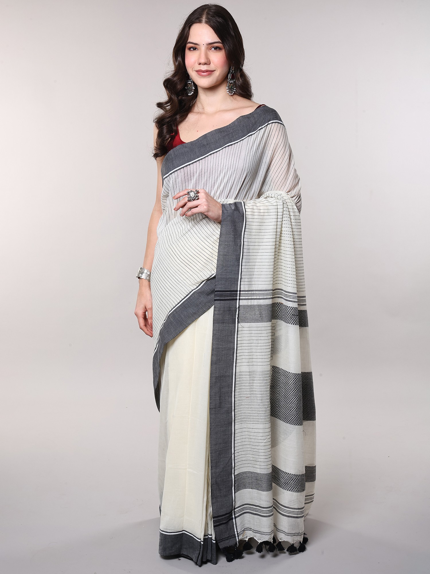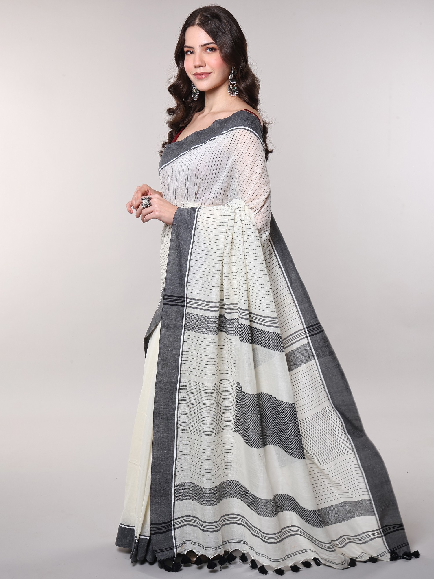 Adding a bold and dramatic flair to the otherwise subtle design is the striking contrast black border. This deep, rich black fabric acts as a frame, drawing the eye and defining the contours of the saree. The border is not just a solid block of color; it is often embellished with complementary weaving patterns or fine lines that echo the weave of the main body, creating a harmonious yet impactful contrast. This strong border not only adds visual interest but also imparts a sense of structure and sophistication to the drape. The pallu, the decorative end piece of the saree, also features this distinctive border, ensuring a cohesive and elegant look when worn.