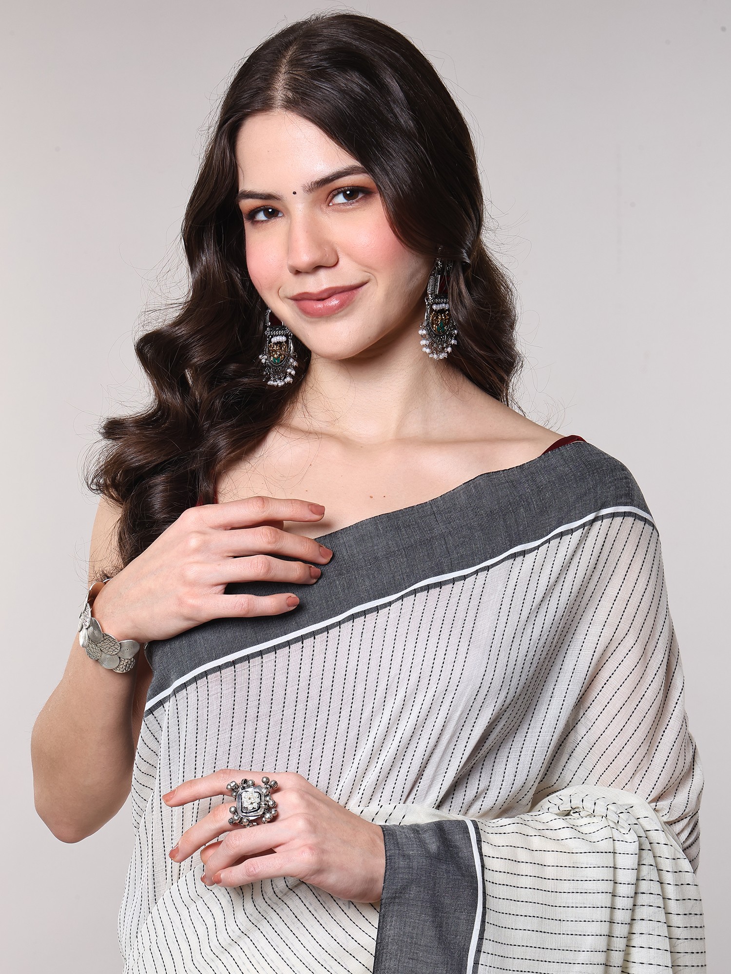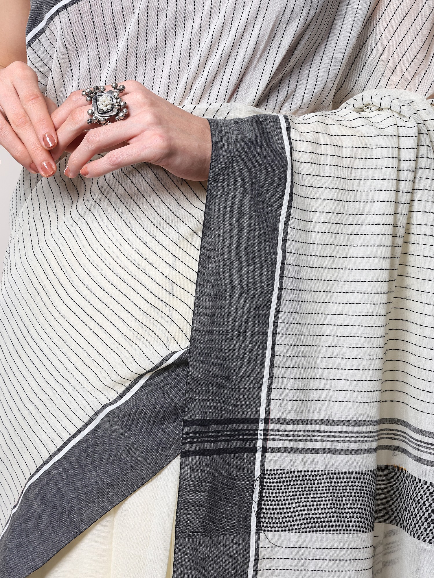 The body of the saree is adorned with a delicate and sophisticated stripe weave. Fine, precisely placed lines in a subtle pattern create a visual rhythm that is both understated and captivating. These fine stripes are not merely decorative; they are a product of meticulous craftsmanship, showcasing the weaver's skill in creating intricate textures with simple threads. The weave adds depth and dimension to the fabric, preventing it from appearing flat and lending it a refined character.