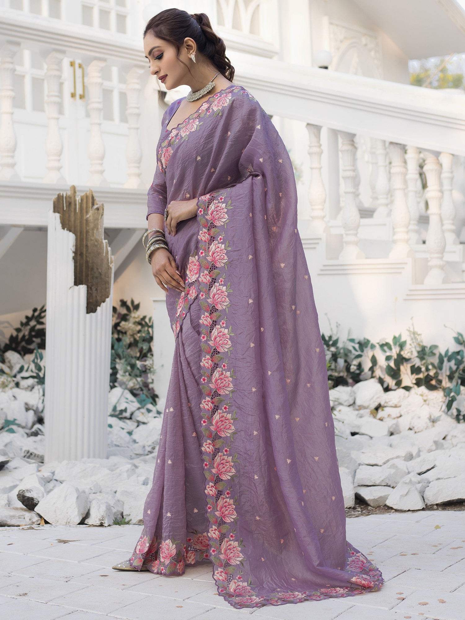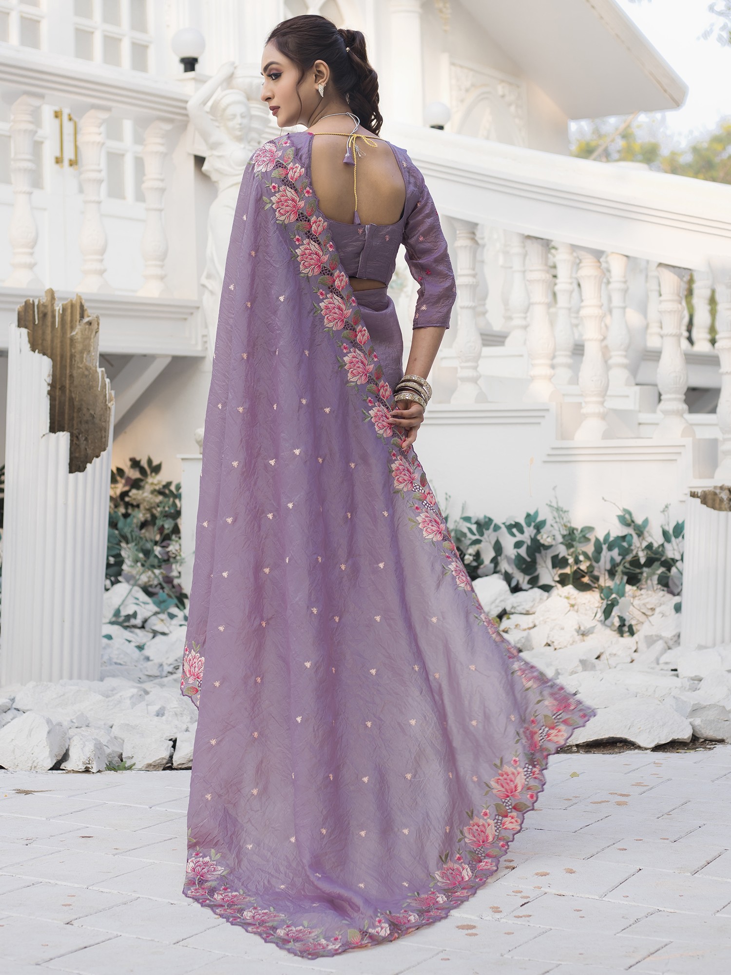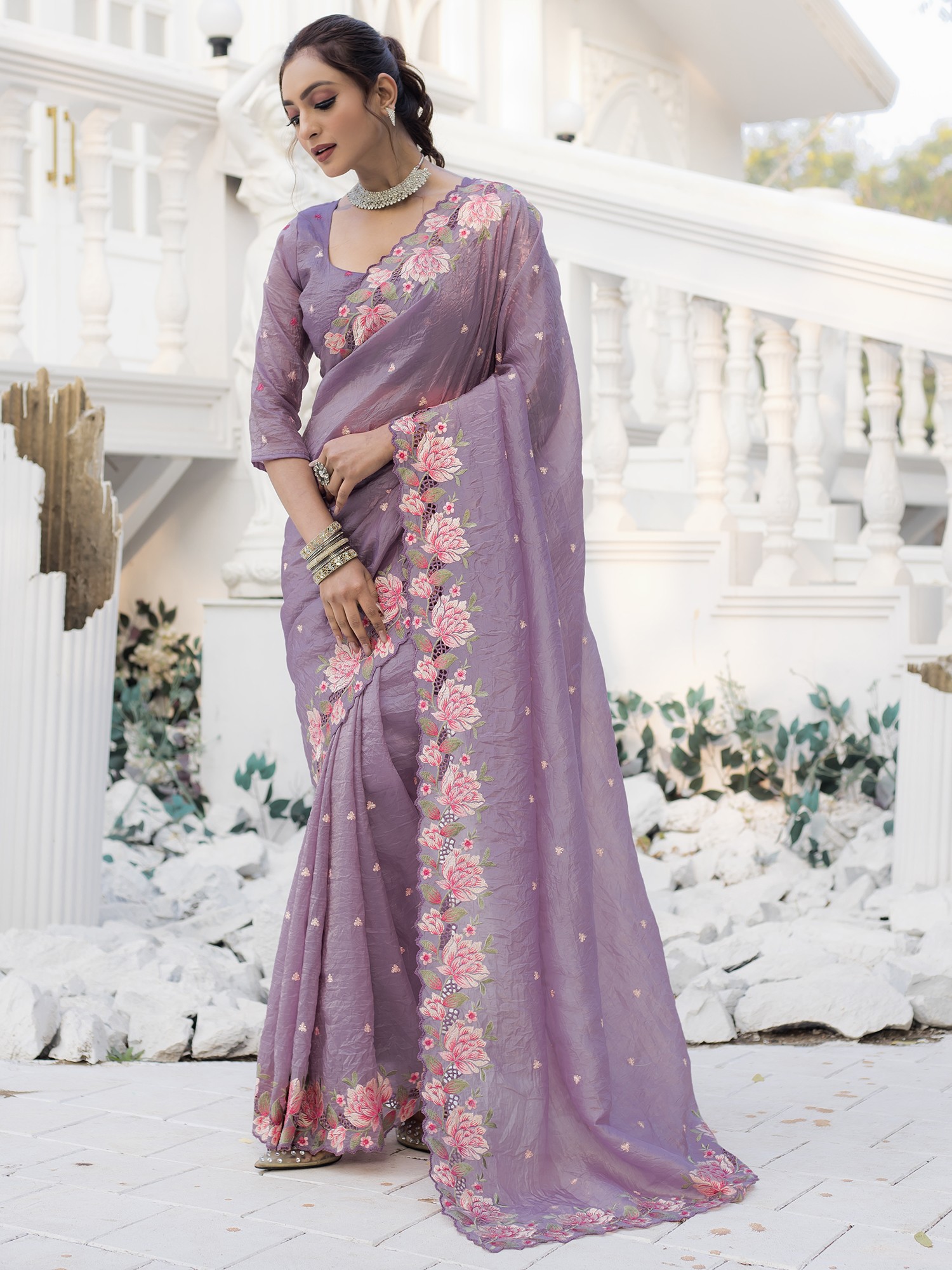 The show-stopping feature of this saree is undoubtedly its intricately embroidered and cutwork floral border. A stunning array of blossoms, rendered in delicate hues, adorns the edges, creating a mesmerizing visual symphony. The cutwork detail adds depth and dimension to the floral design, making it appear as though the blooms are springing forth from the fabric itself. Each stitch is a testament to the skill and dedication of the artisans who poured their heart and soul into its creation.