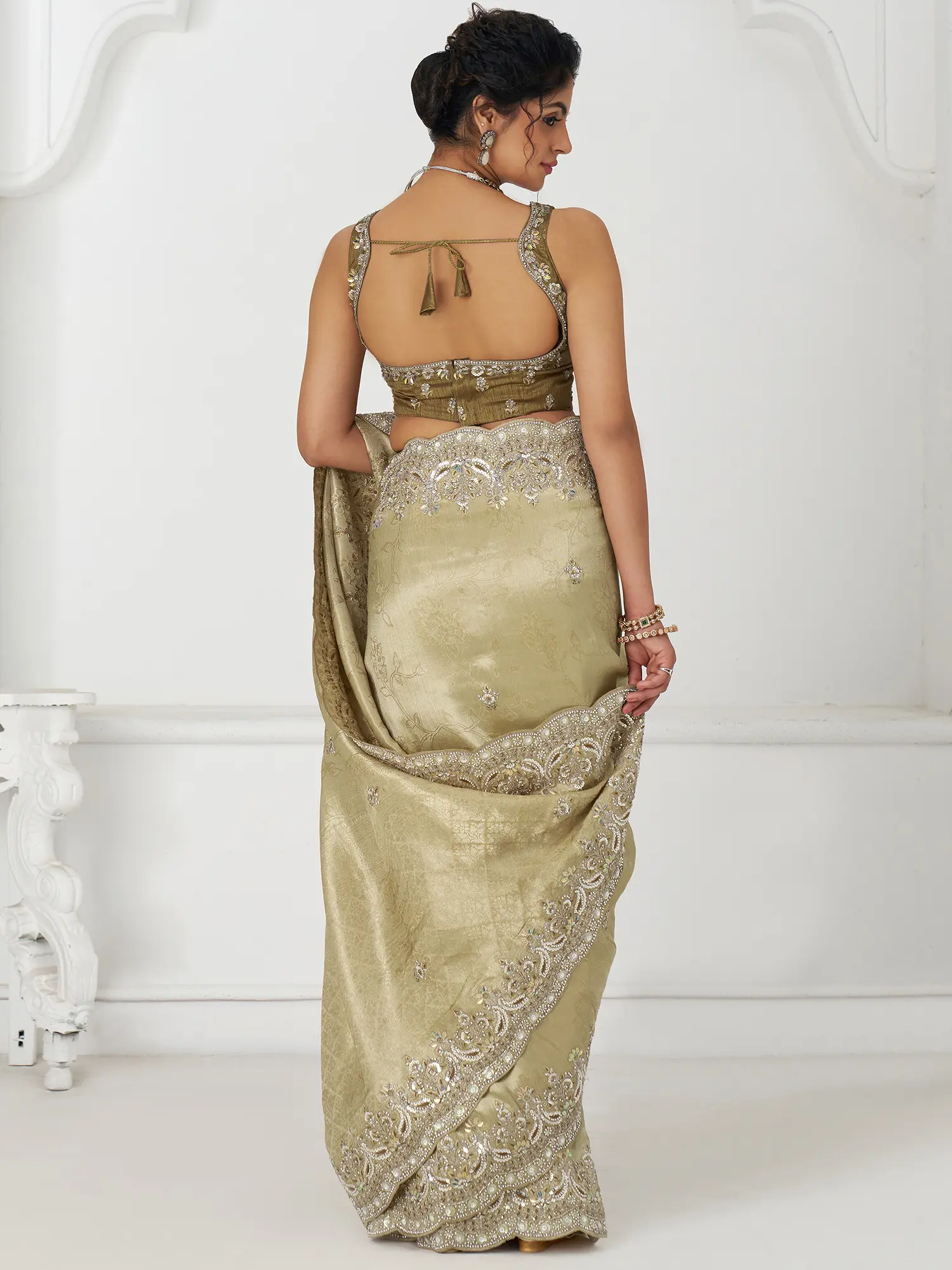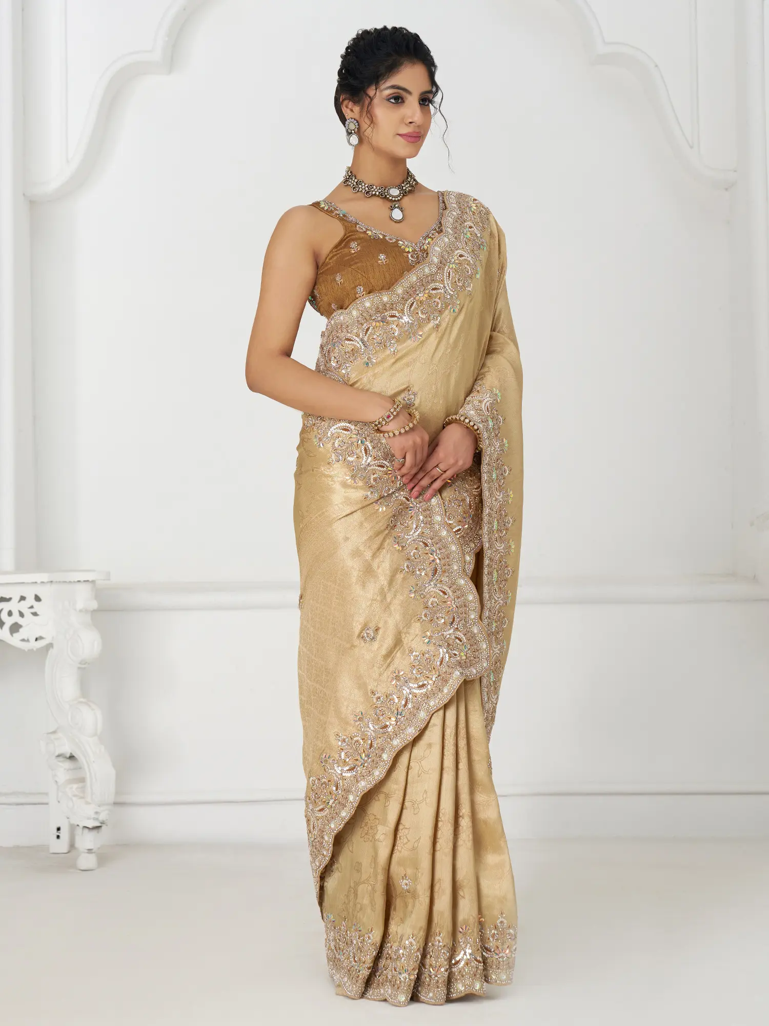 Women Elegant Beige Embroidered Flared Silk Kurta Set With Pants For Party Wear And Festive Occasions