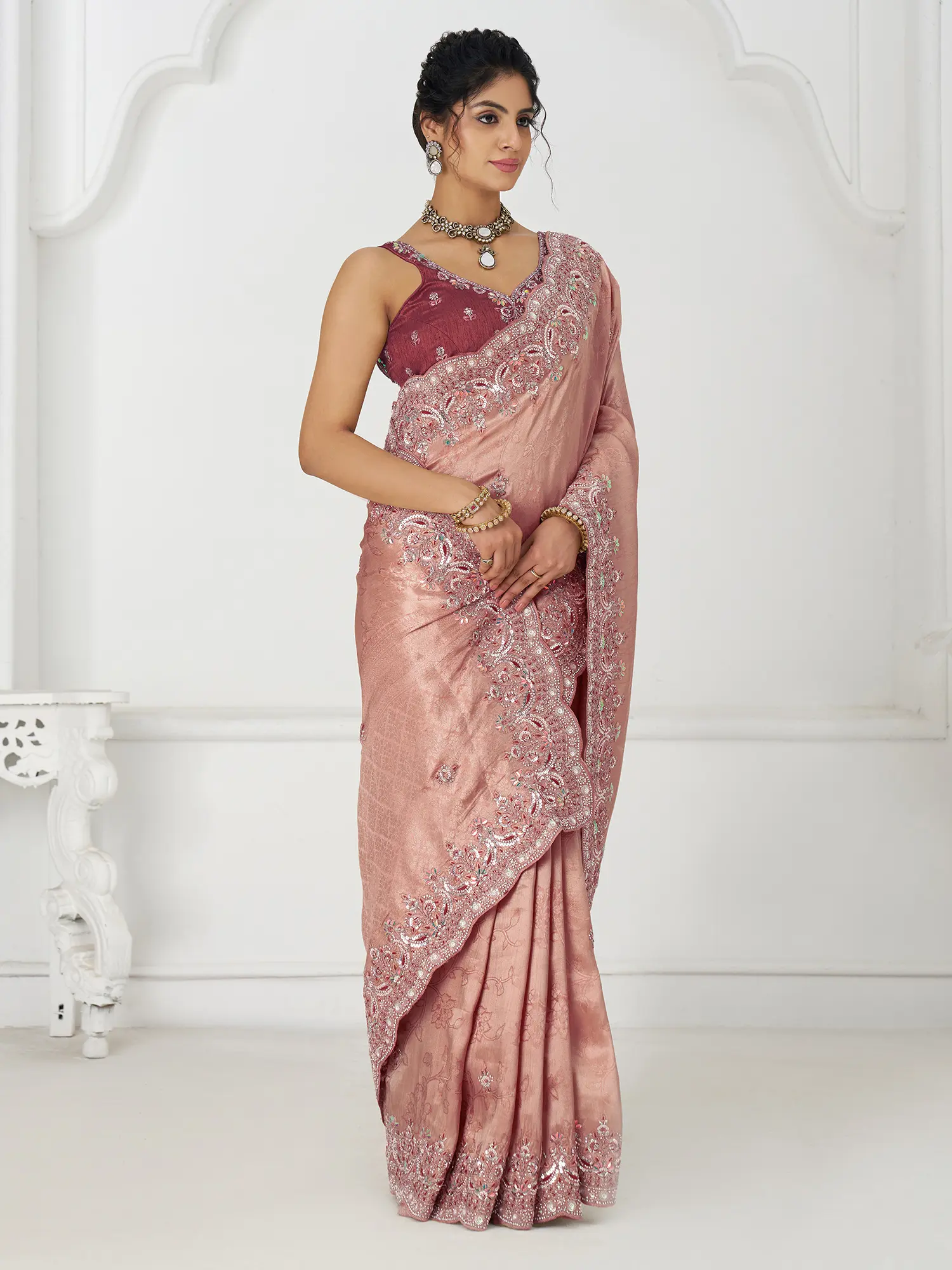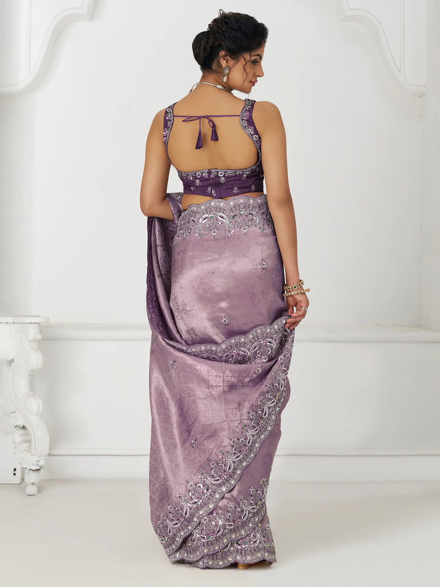 This saree offers versatility in styling, allowing you to create a look that is uniquely your own. For a traditional look, pair it with gold jewelry and a classic updo. For a more contemporary feel, opt for statement earrings and a sleek, modern hairstyle. The saree's neutral color palette makes it easy to accessorize with a variety of colors and styles. The blouse can be tailored to your exact measurements and specifications to ensure a perfect fit. Whether you prefer a simple, understated design or a more elaborate, embellished style, the blouse can be customized to complement the saree and your personal taste. Complete the look with comfortable footwear and a clutch that complements the embellishments on the border.