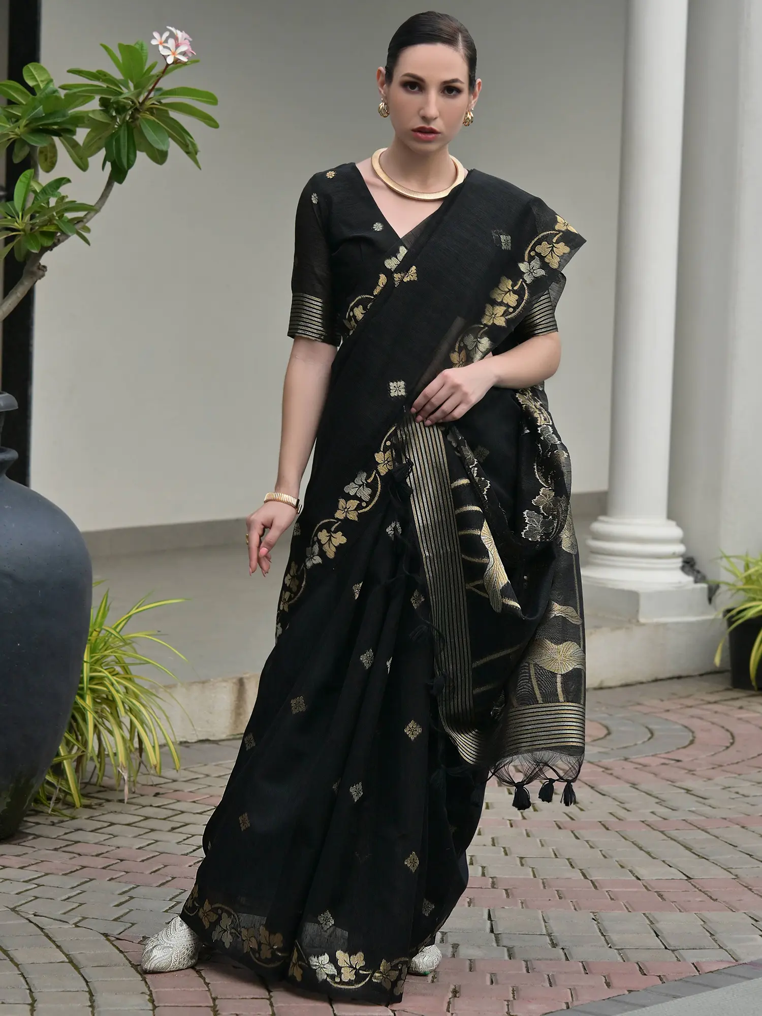 Discover a masterpiece of traditional Indian craftsmanship with this exquisite Linen Silk Saree. Designed for the discerning individual who appreciates timeless beauty and luxurious comfort, this saree is a testament to sophisticated style. The rich, deep black hue serves as a canvas for the intricate artistry, making it a versatile addition to any wardrobe, perfect for grand celebrations, formal gatherings, or even elegant evening affairs.