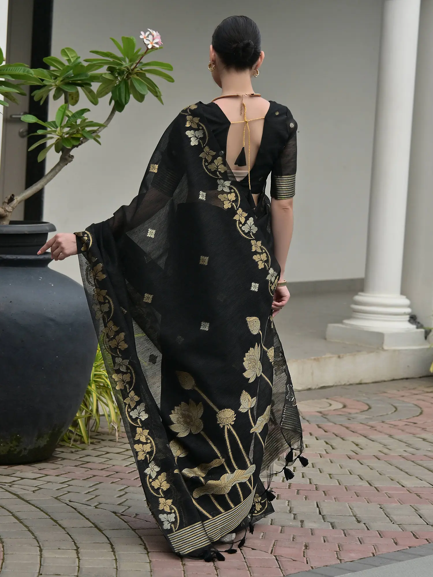 This Linen Silk Saree is designed to be a versatile statement piece. Its classic black color provides a sophisticated backdrop for various styling possibilities. Pair it with traditional gold jewelry for a timeless, ethnic look, or experiment with contemporary accessories to infuse a modern twist. The saree drapes beautifully, allowing for effortless styling that complements every figure. The thoughtful design ensures it remains a cherished item in your collection for years to come, a piece that transcends fleeting trends and embodies enduring style. This saree is more than just an garment; it is an heirloom in the making, a celebration of tradition and artistry.