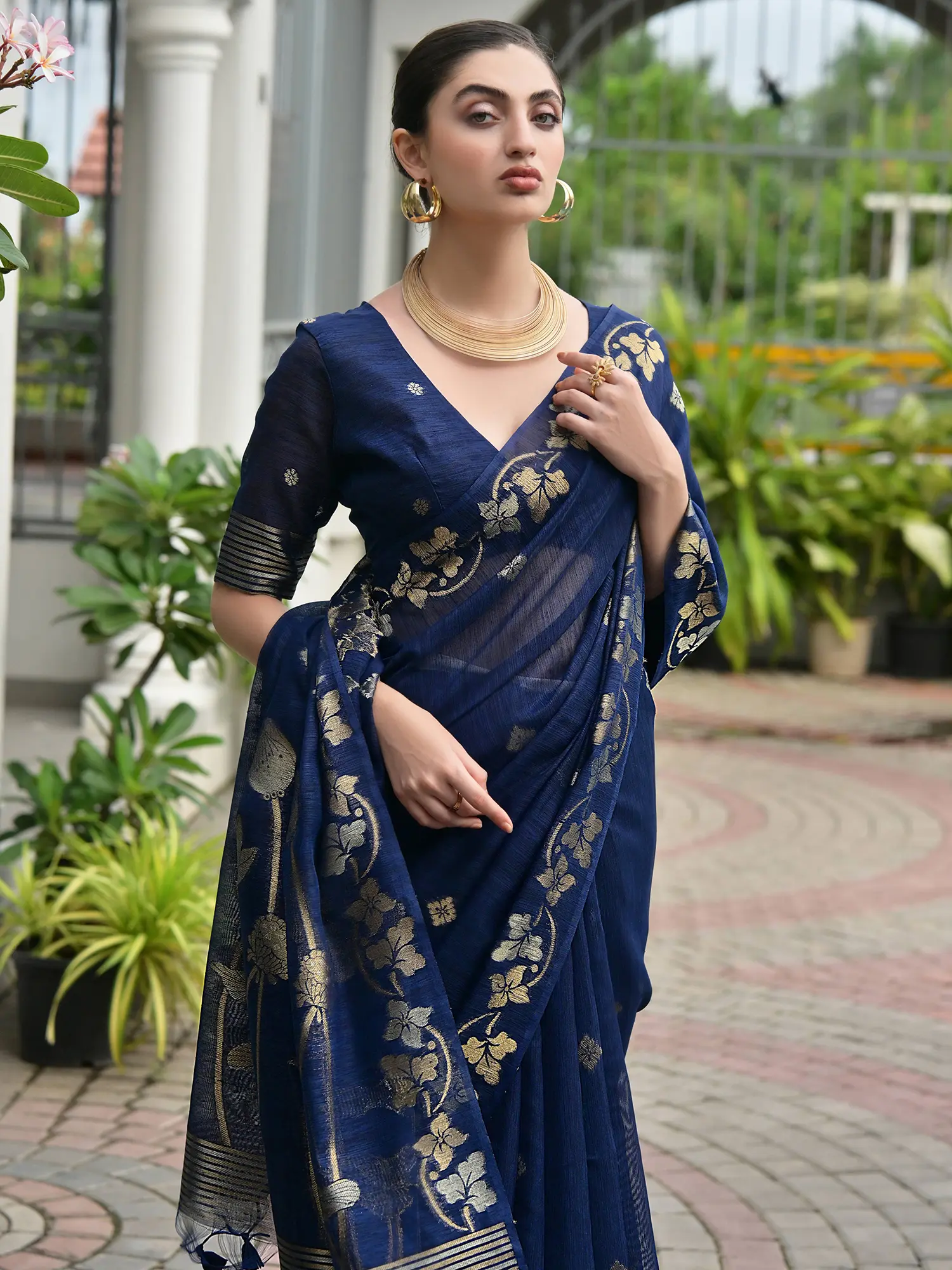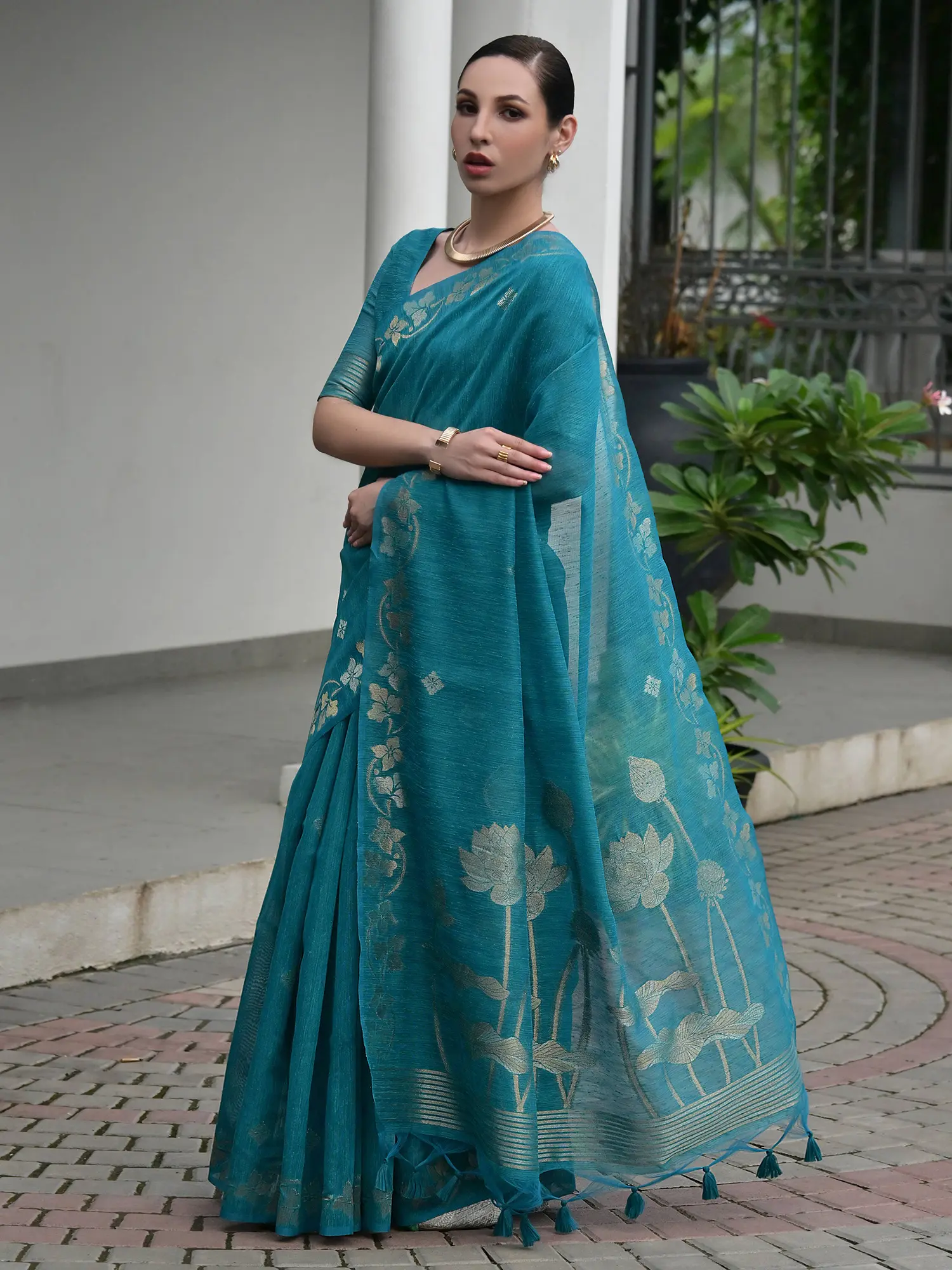 Slub Linen Saree with Floral Zari Border and Anchal