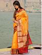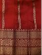 The broadness of the border allows for a charming display of a paisley motif, interlinked like a creeper while the pallu becomes enriched with an intricate Zari work that contrasts gorgeously with the red fabric.
