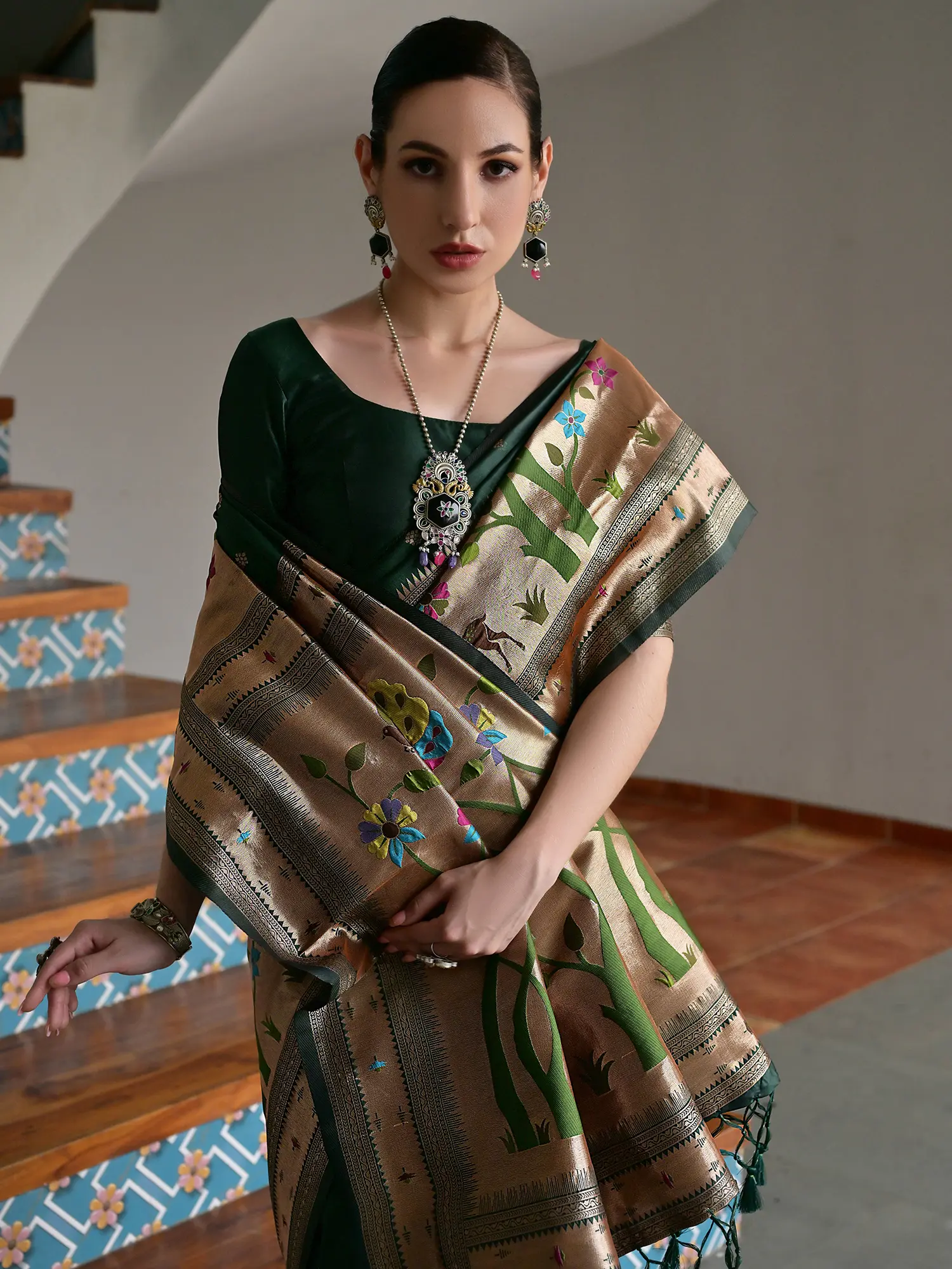 Features a vibrant emerald green Paithani silk body with a contrasting rich pallu and borders.