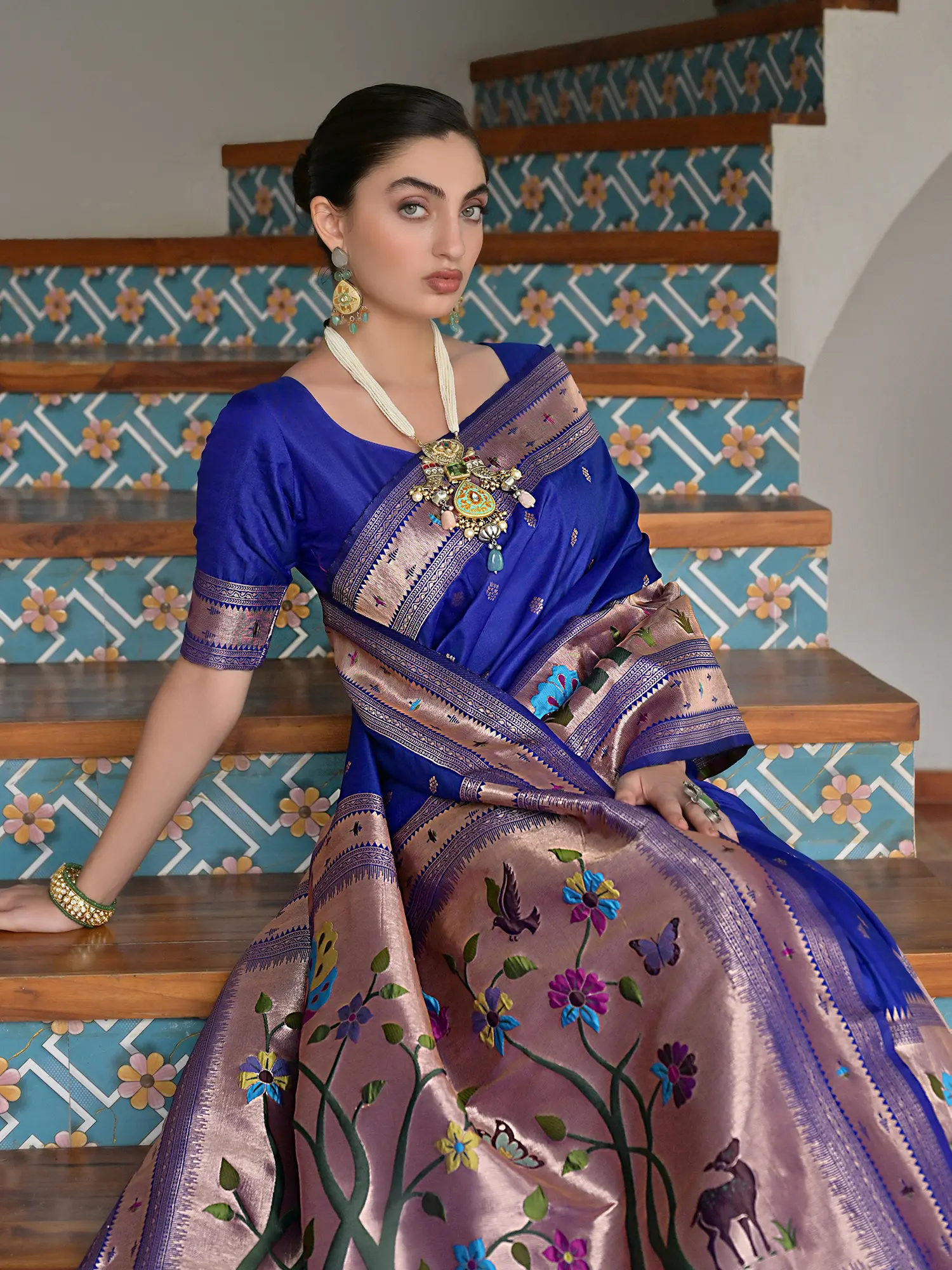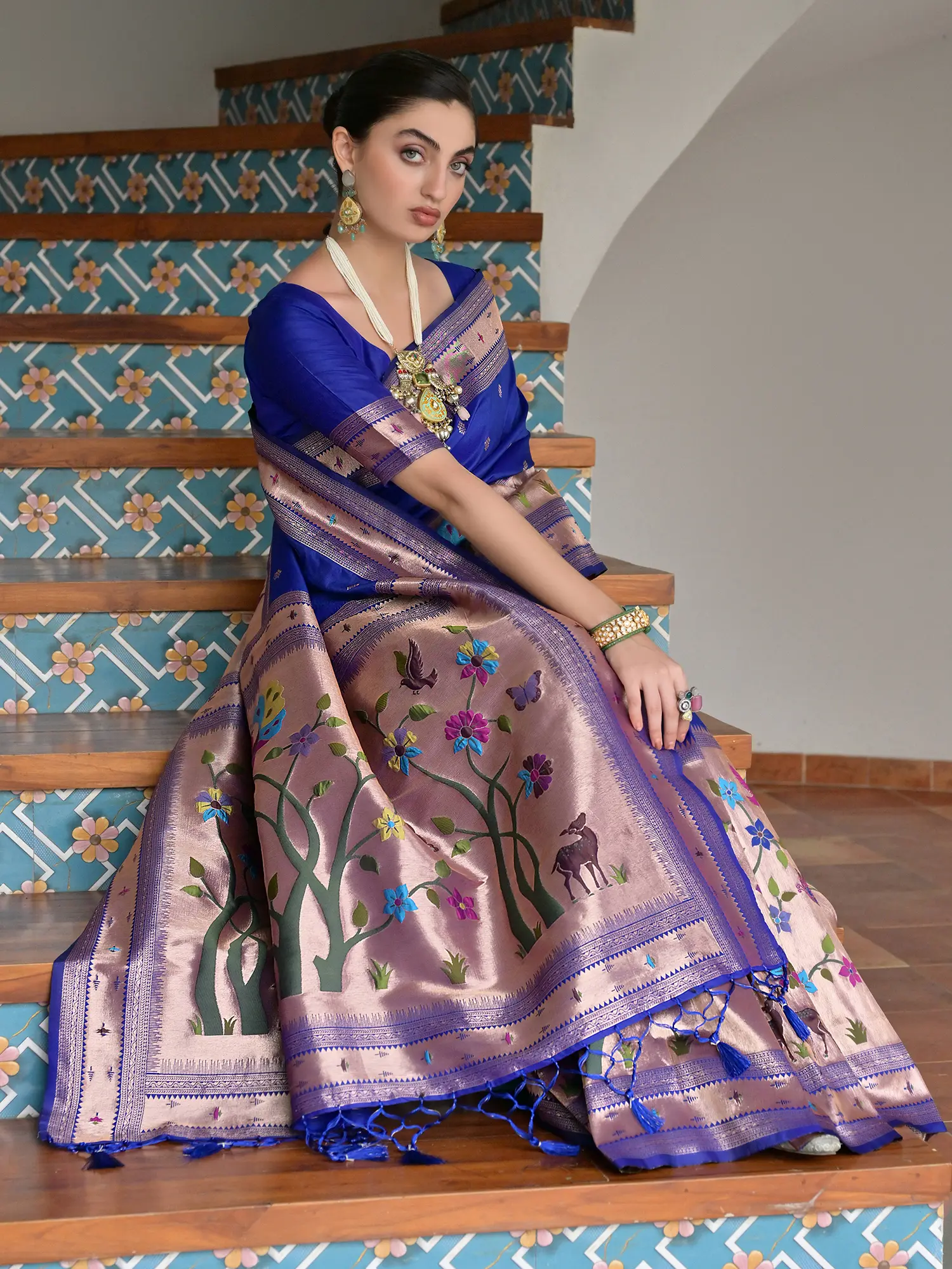 This Paithani silk saree is more than just an outfit; it's a celebration of Indian heritage and a symbol of grace. The rich texture of pure silk ensures comfort and a graceful flow, making it ideal for grand occasions such as weddings, festivals, and formal gatherings. The traditional motifs and the classic weaving style evoke a sense of timeless elegance, ensuring that this saree will be a cherished heirloom for generations to come. The contrast of the rich silk base with the vibrant and detailed embellishments creates a harmonious blend of tradition and artistry, making it a truly unforgettable piece.