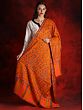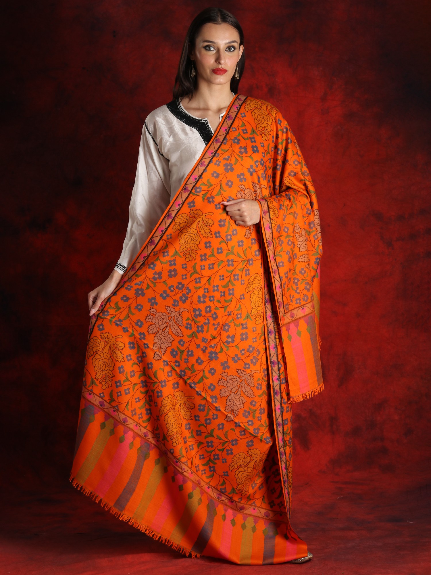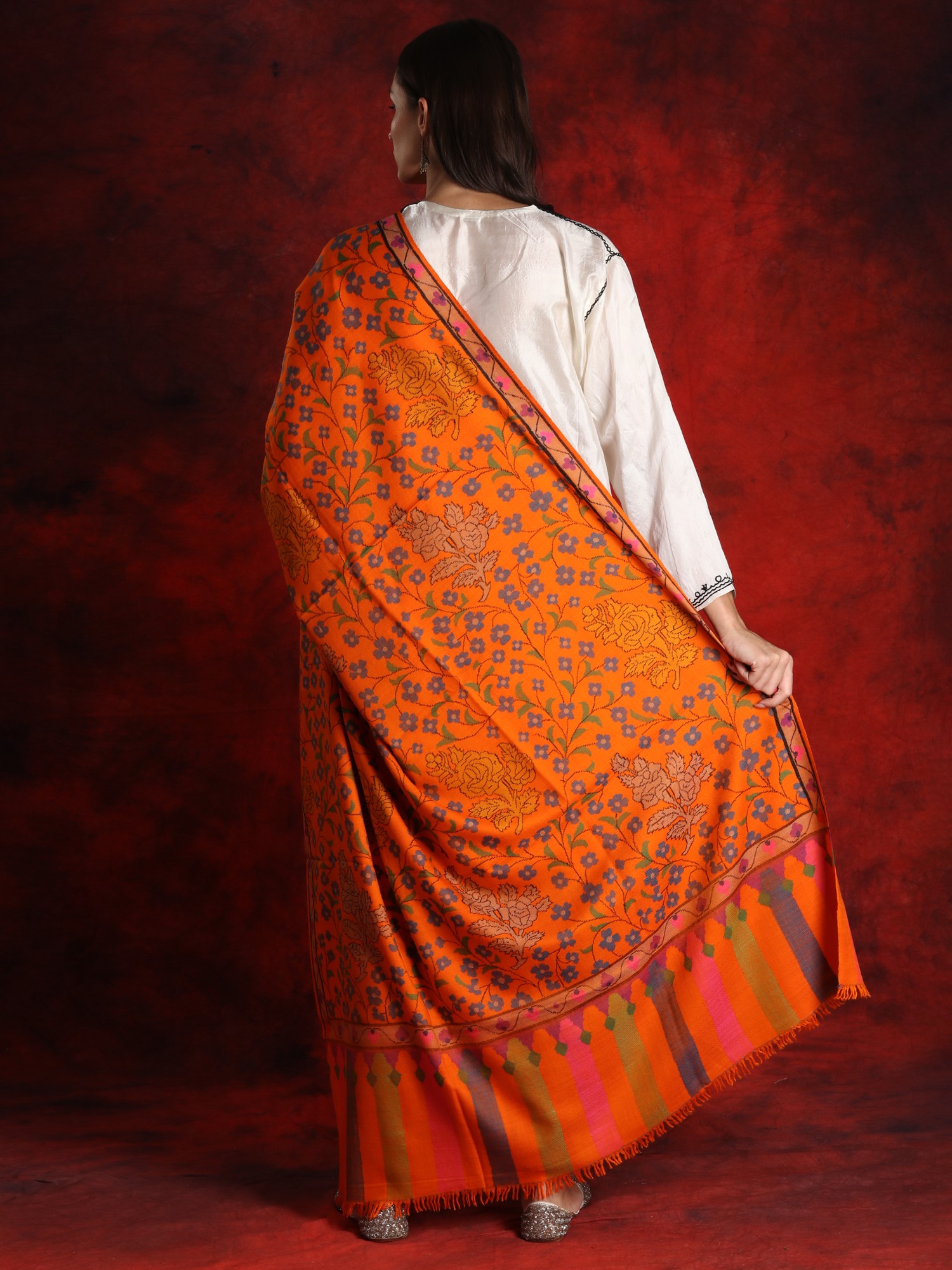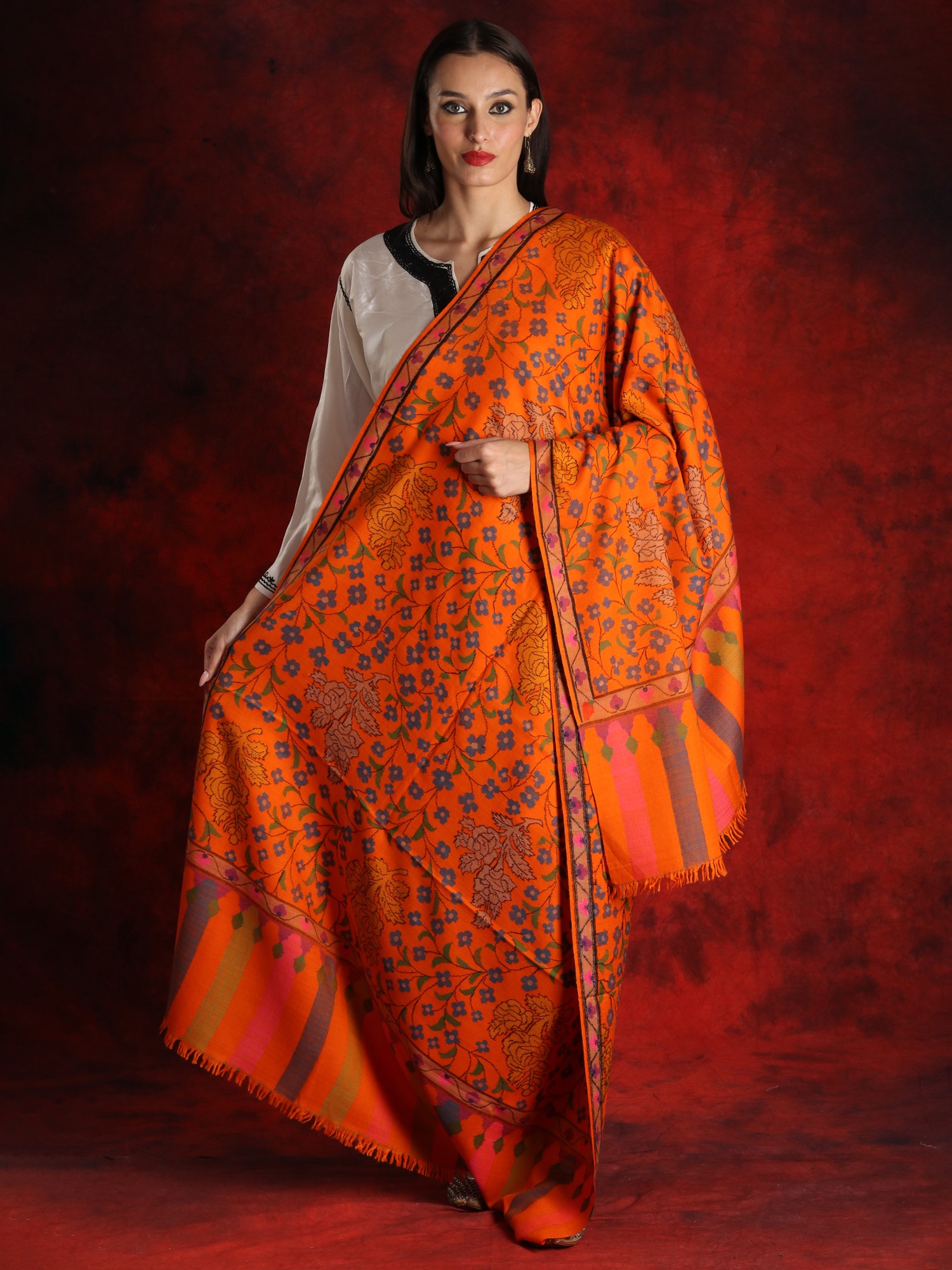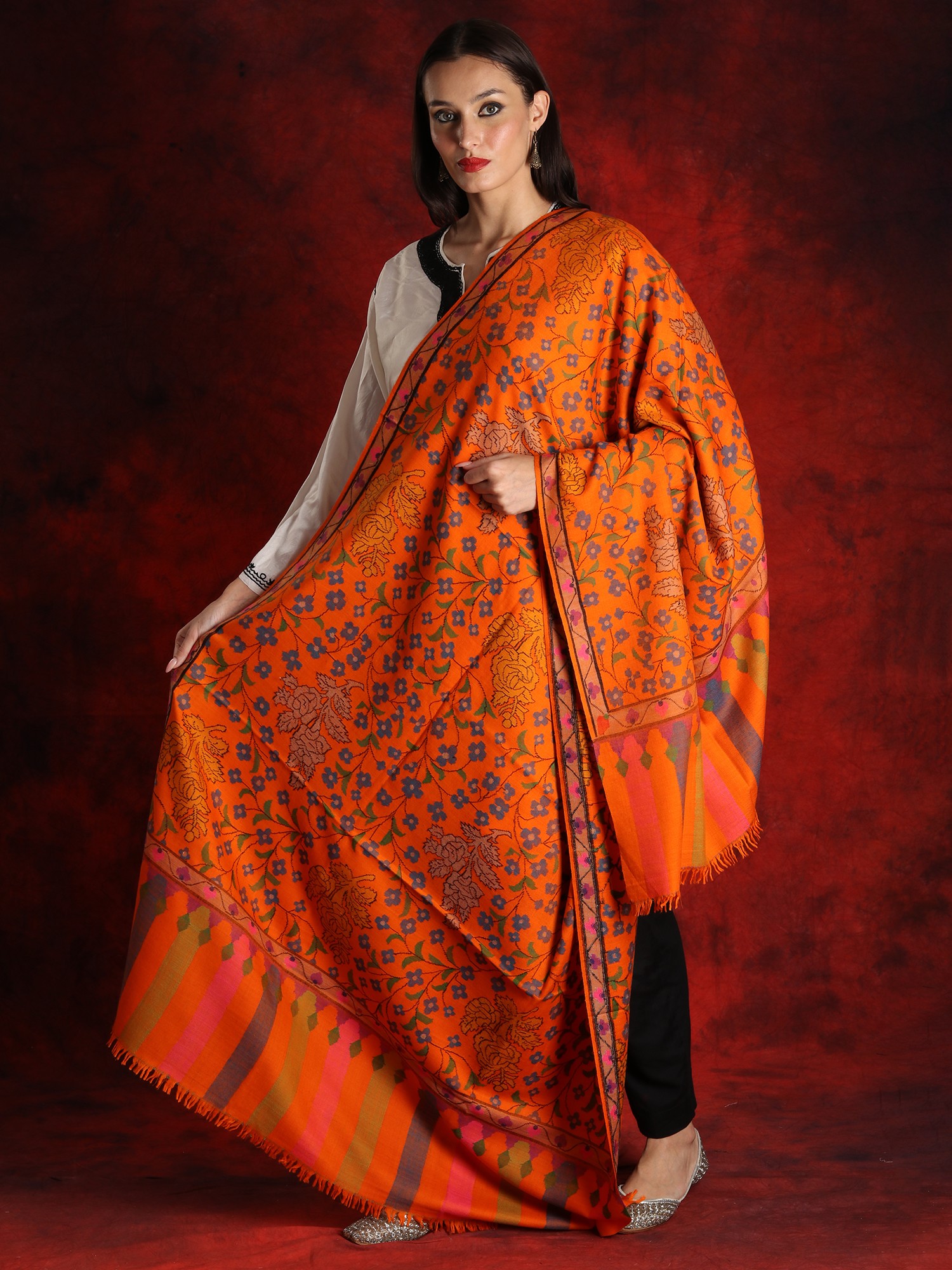 Crafted by hand from pure Pashmina wool, this majestic shawl combines tradition and modernity. A lot of attention to detail has been given while creating this masterpiece. Adding a pop of color, the bright orange used as a base instantly attracts the attention of the beholder. Drawing inspiration from mother nature, the artist has created a pattern of flowers and floral vines using the ancient Kani weaving. This technique is quite popular when it comes to adorning Pashmina products with beautiful patterns. Involving the use of bobbins to weave the design into the fabric, this technique requires a high level of dexterity and concentration.