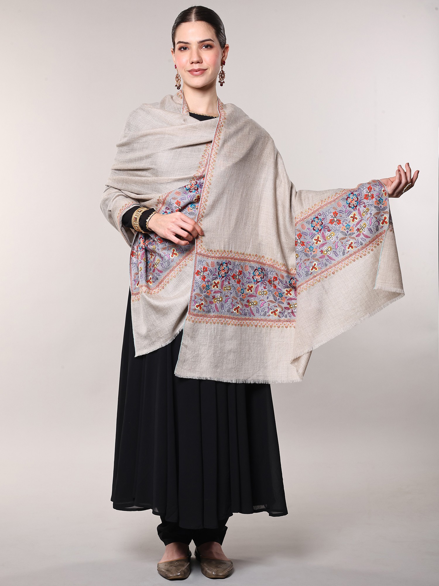 Immerse yourself in the unparalleled luxury of this exquisite pure pashmina shawl, a testament to the rich artisanal heritage of Kashmir. Crafted from the finest downy wool of the Changthangi goat, this shawl offers a softness and warmth that is simply divine. The natural, undyed hue of the pashmina serves as a delicate canvas, allowing the intricate embroidery to truly shine. It’s more than just an accessory; it’s a piece of art designed to elevate your wardrobe and envelop you in unparalleled comfort.