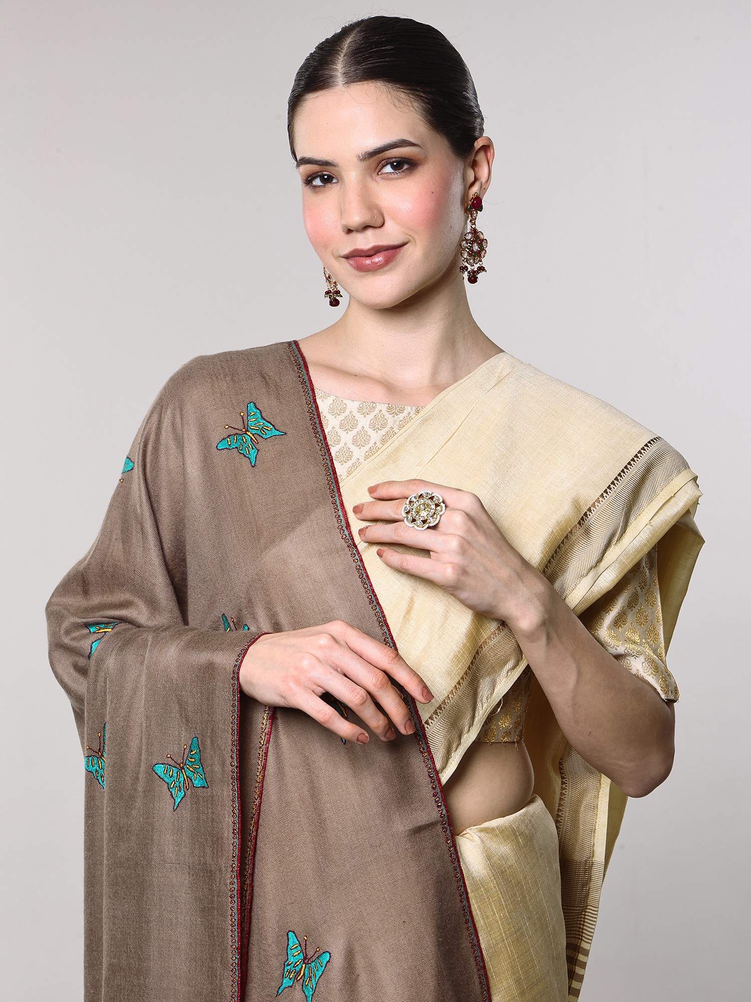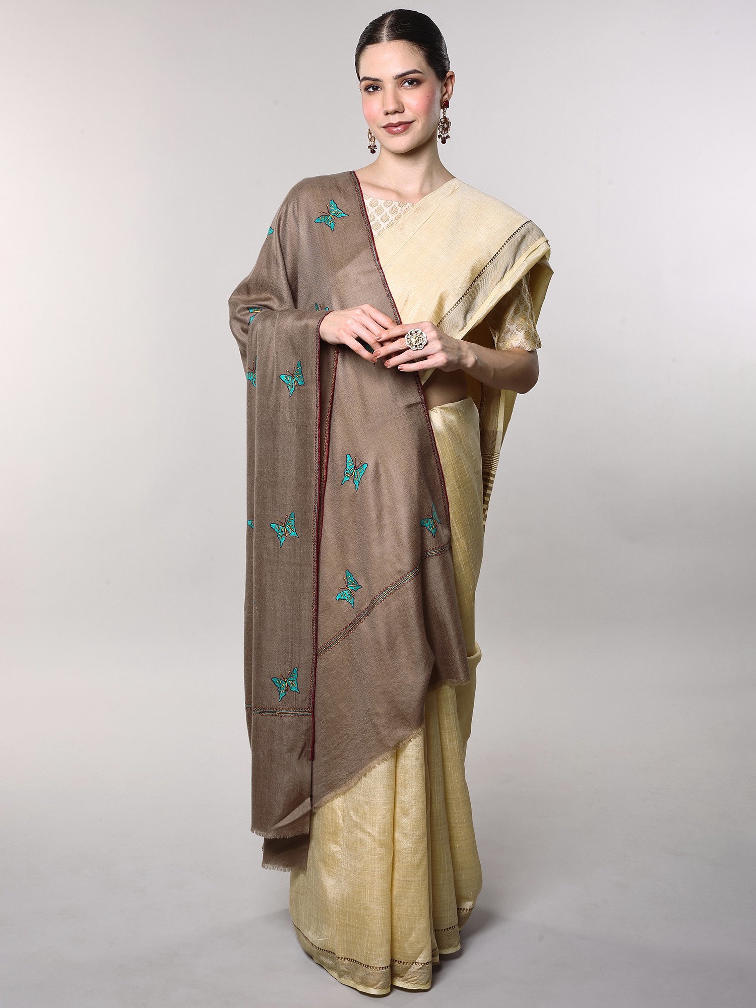 Pure Pashmina Shawl from Kashmir with Sozni Hand-Embroidered Butterflies