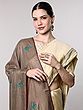 Adorning the rich taupe canvas of this Pashmina shawl is a mesmerizing display of hand-embroidered butterflies. These delicate motifs are rendered with the intricate Sozni embroidery technique, a hallmark of Kashmiri craftsmanship. Each butterfly is a tiny masterpiece, brought to life with vibrant, shimmering teal threads that contrast beautifully with the neutral base. The meticulous stitching captures the ephemeral beauty of these winged creatures, lending an air of whimsical charm and sophisticated detail. The edges of the shawl are finished with a subtle, yet elegant, embroidered border in a complementary maroon hue, adding a touch of refined contrast and ensuring a polished drape.